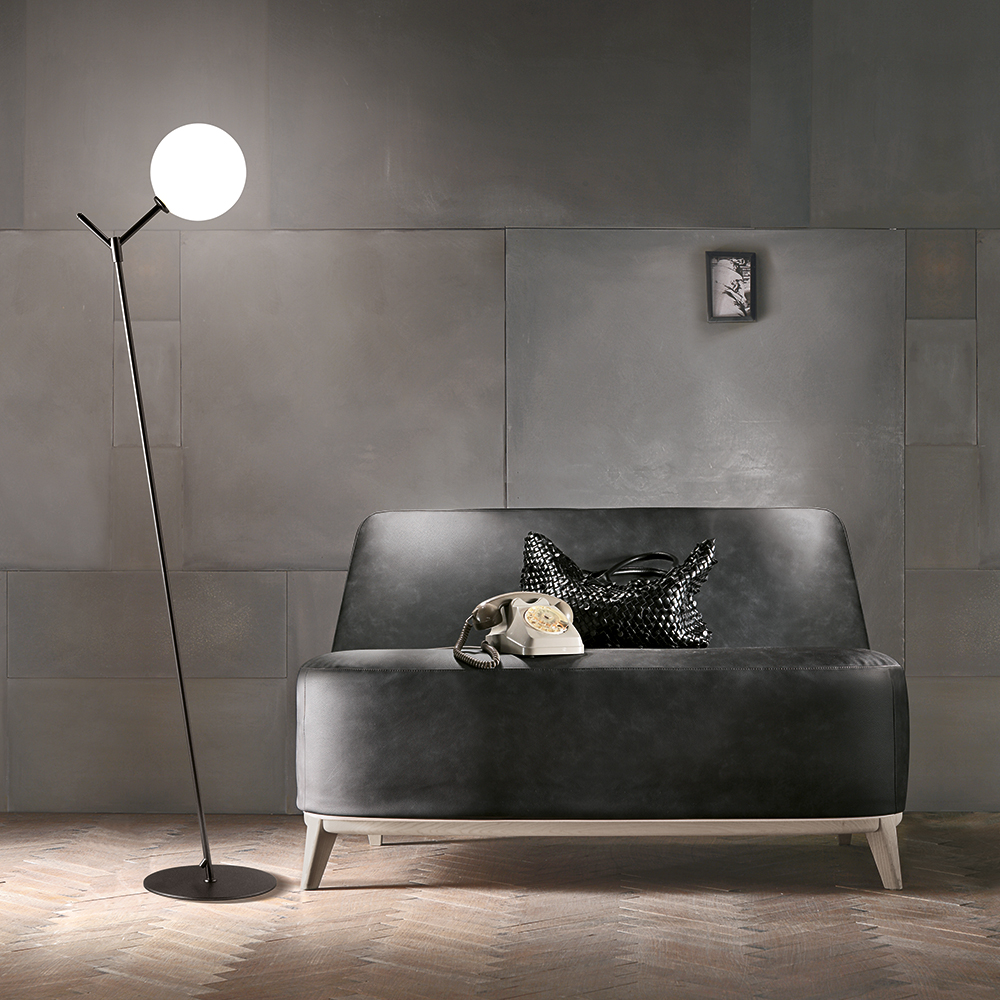 Lámpara de pie en estructura de metal negro y esfera de cubierta de lámpara blanca.