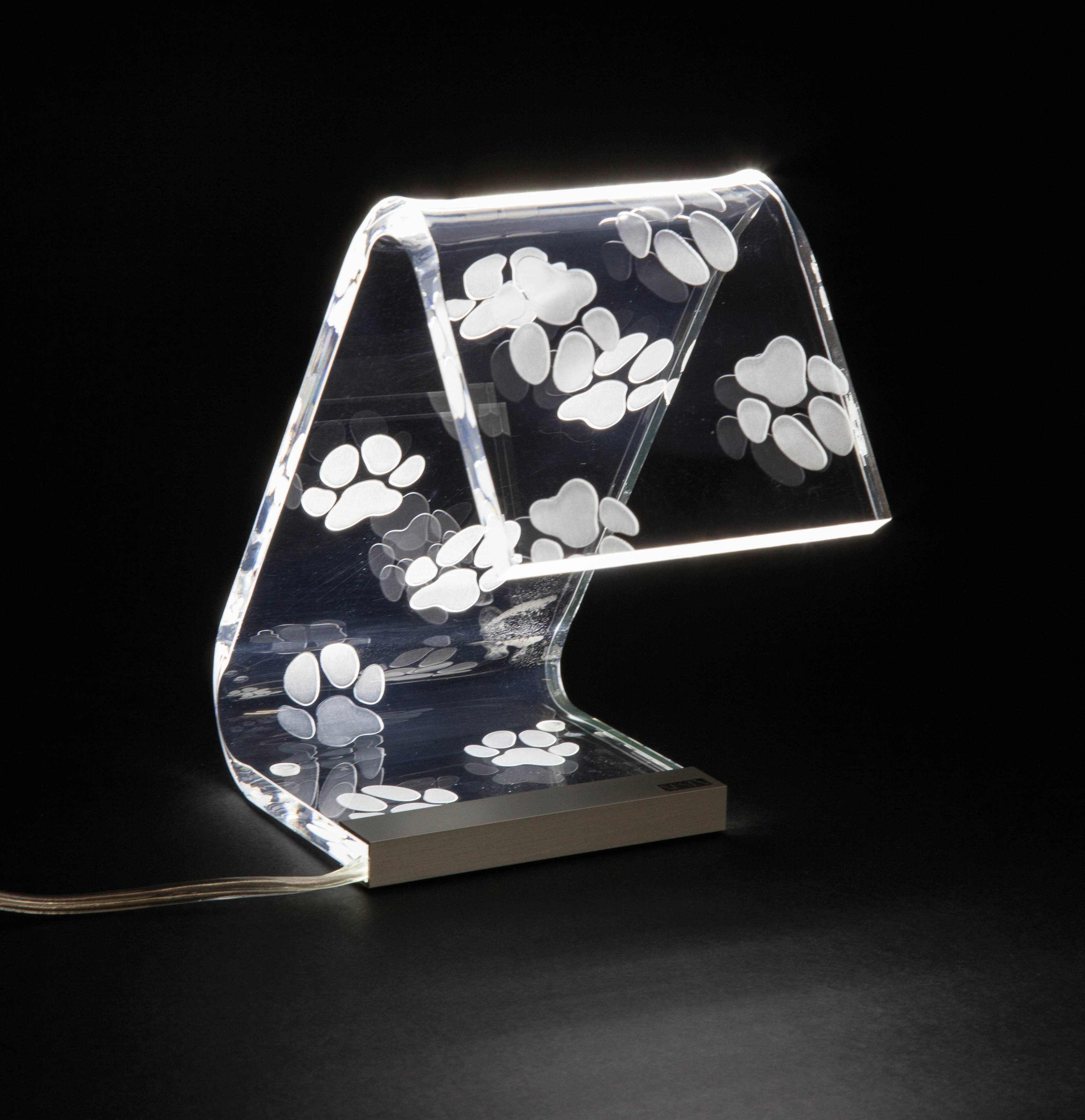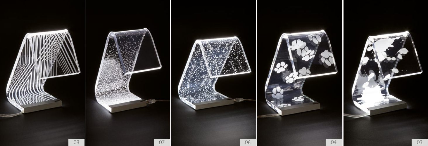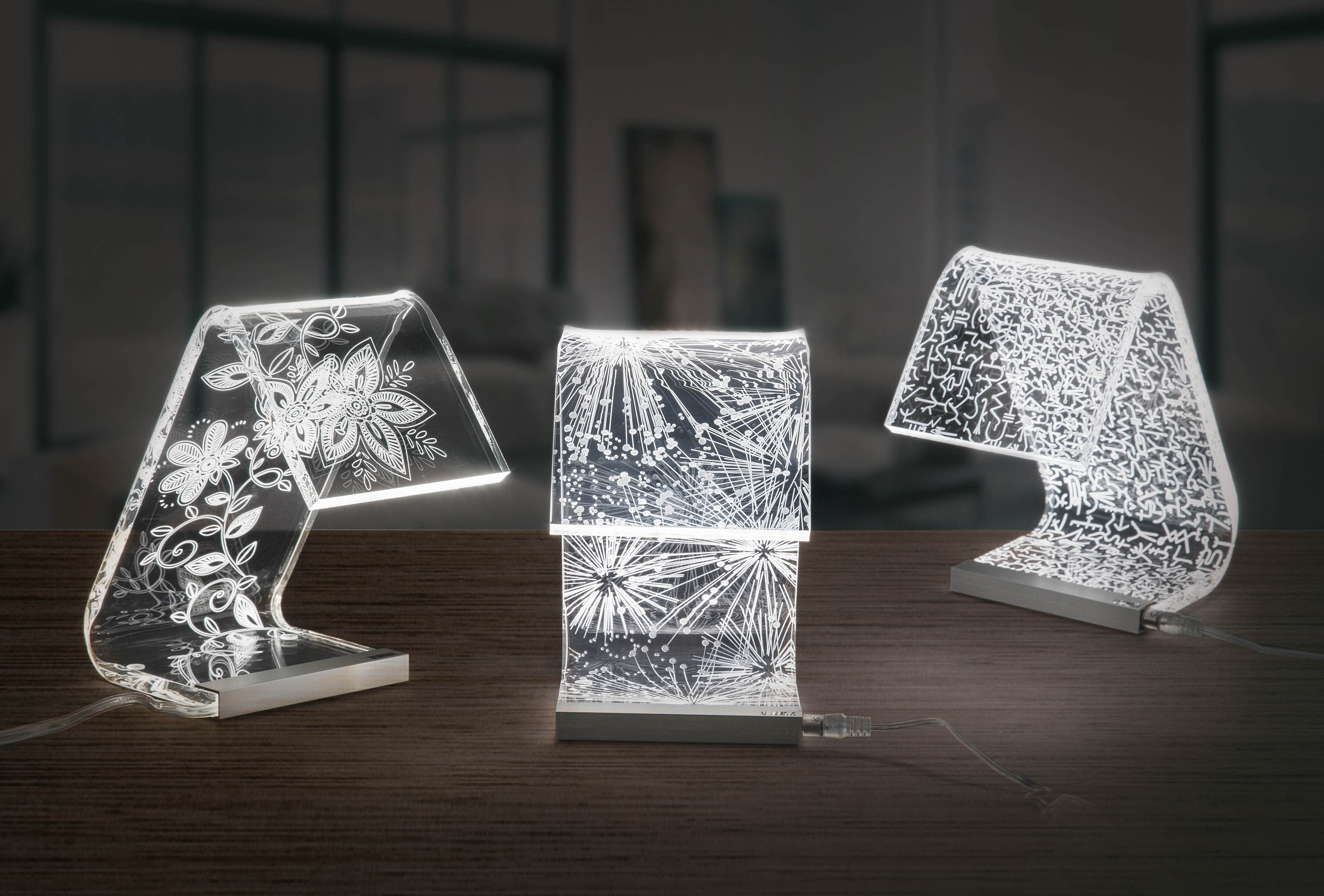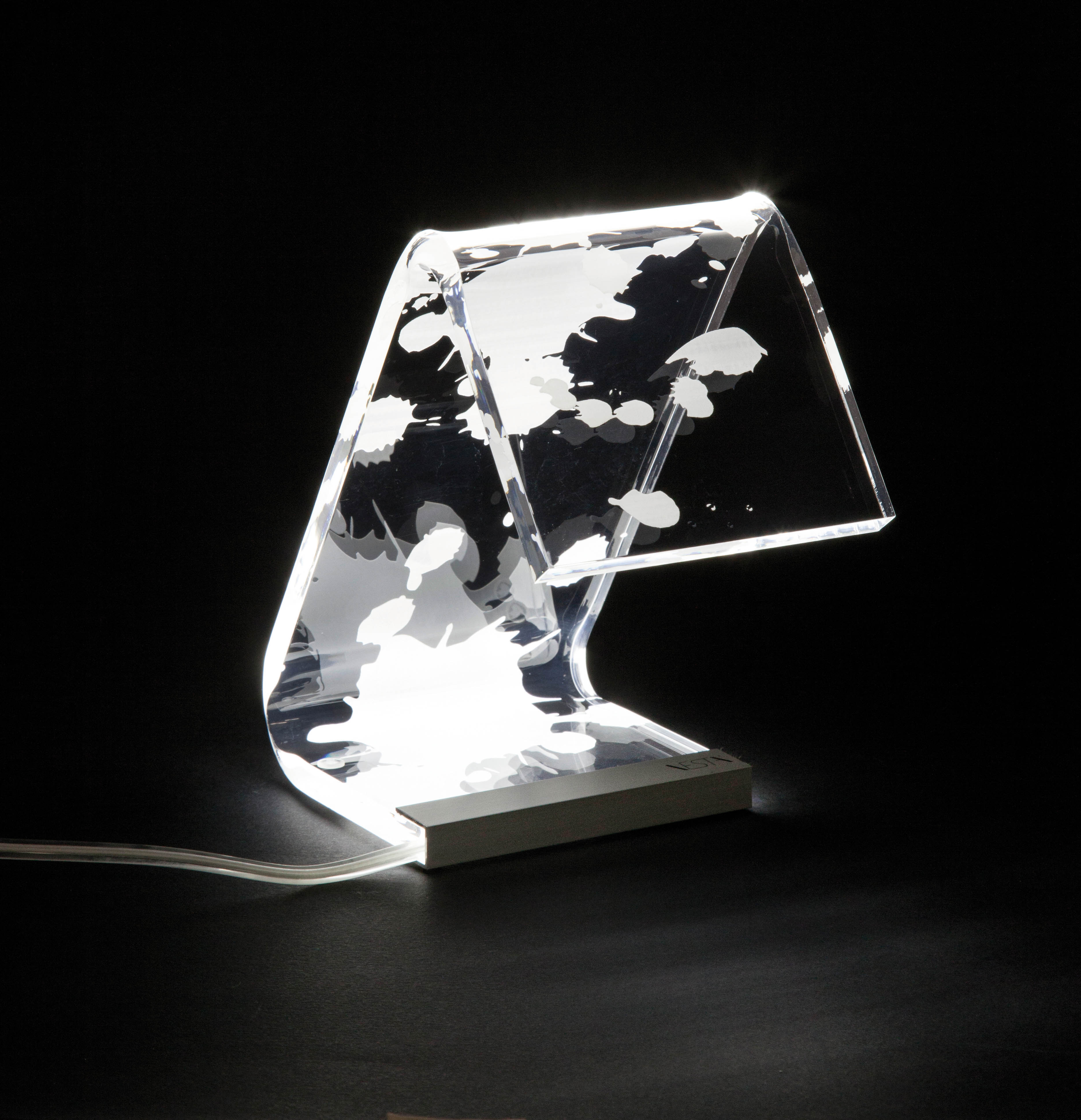 Lámpara de mesa de cristal acrílico transparente con decoración grabada.
