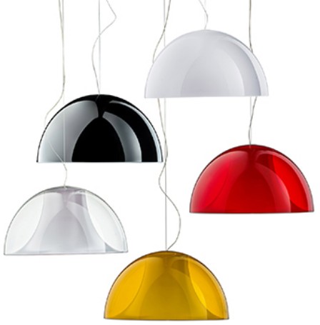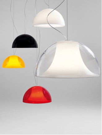 Dos carcasas de policarbonato se unen para crear la lámpara de suspensión L002S. La carcasa interna, en material opal, difunde la luz y al mismo tiempo oculta la bombilla, la externa está disponible en diferentes colores, tanto transparentes como a todo color.