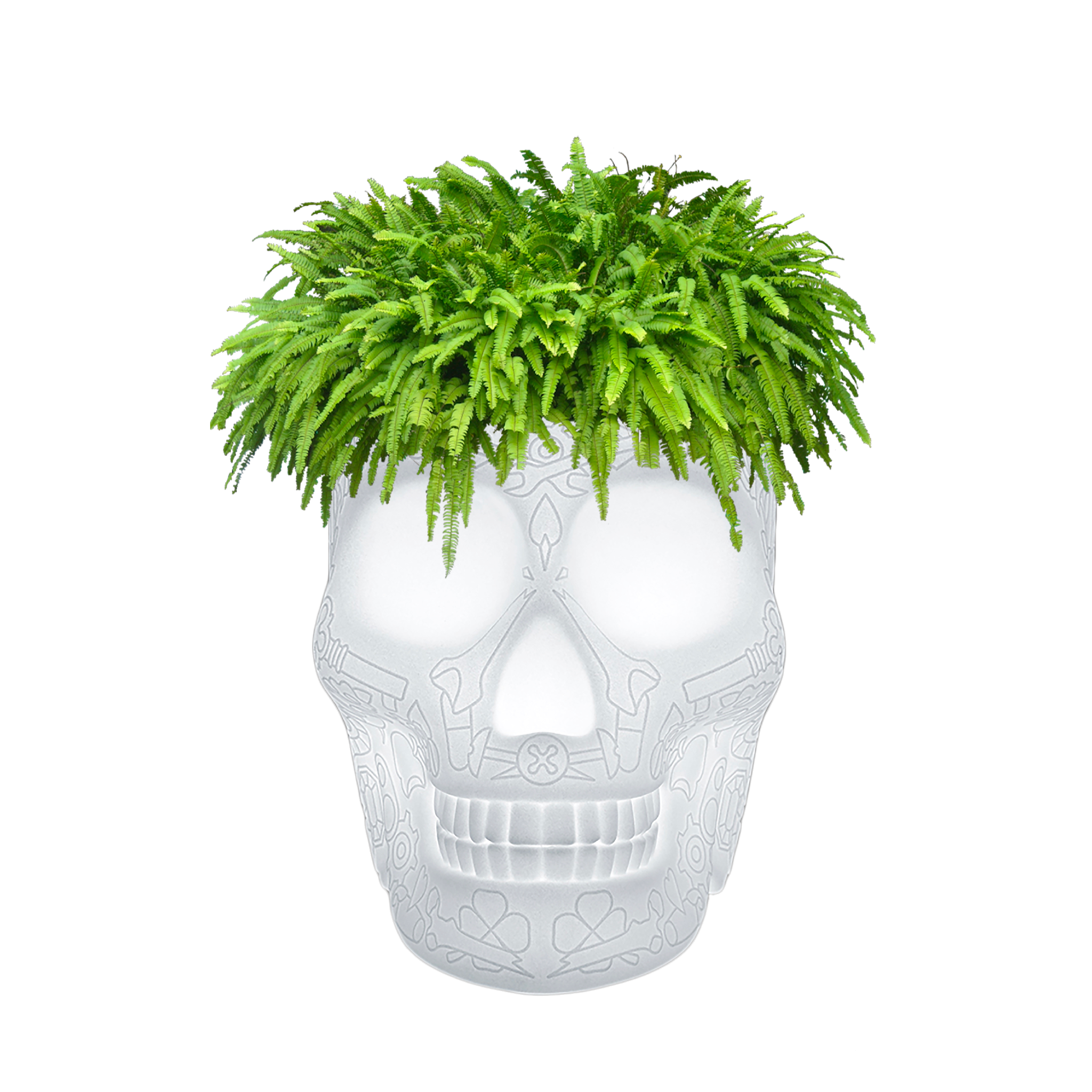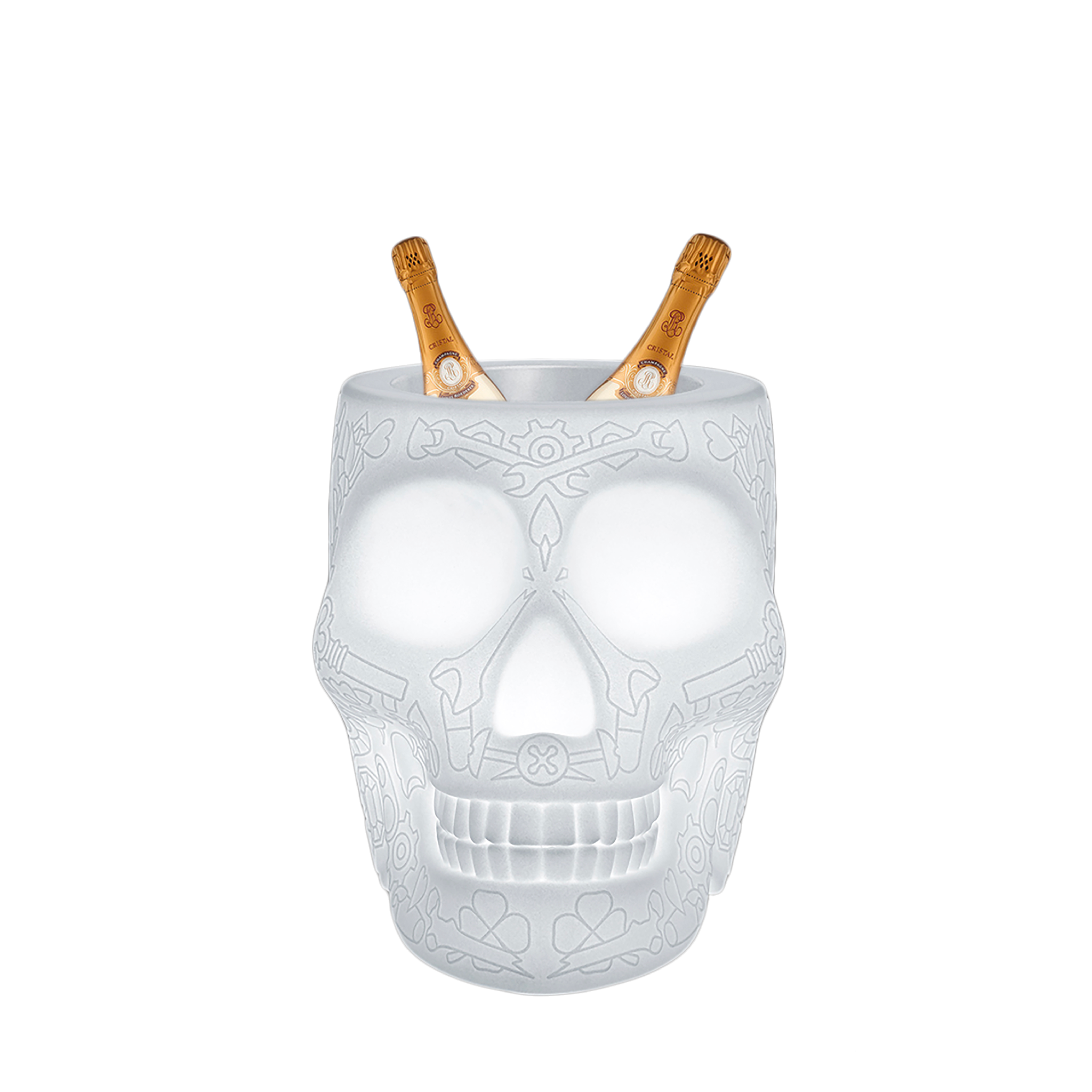 Mexico, diseñada por Studio Job, es una lámpara en forma de calavera con un motivo gráfico en la superficie, que funciona tanto como macetero como enfriador de champán. Con reminiscencias de las tradicionales calaveras pintadas del país homónimo, México es un caprichoso recordatorio del carácter cíclico de nuestra presencia en la Tierra, para exorcizar la muerte y celebrar la vida. Perfecta para salones, comedores y espacios exteriores. Inalámbrico, con batería recargable, luz LED y 16 colores RGB diferentes intercambiables, se puede ajustar a distancia mediante control remoto.