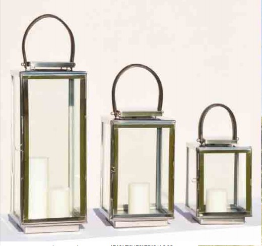 Farol en acero inoxidable y cuero negro.