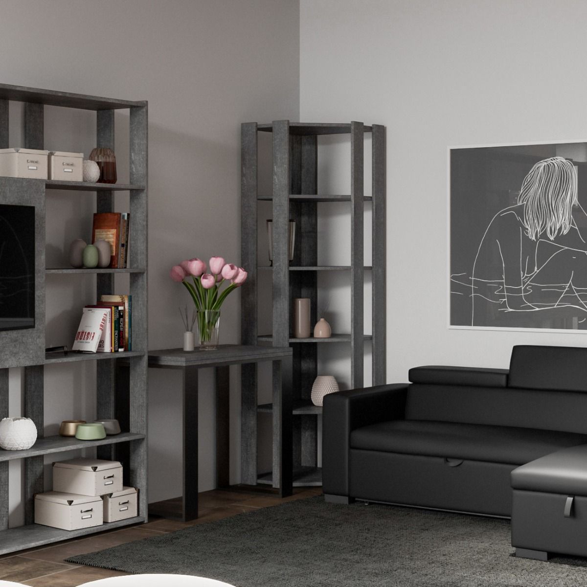 Librería de esquina con paneles laterales abiertos y sin pared trasera.