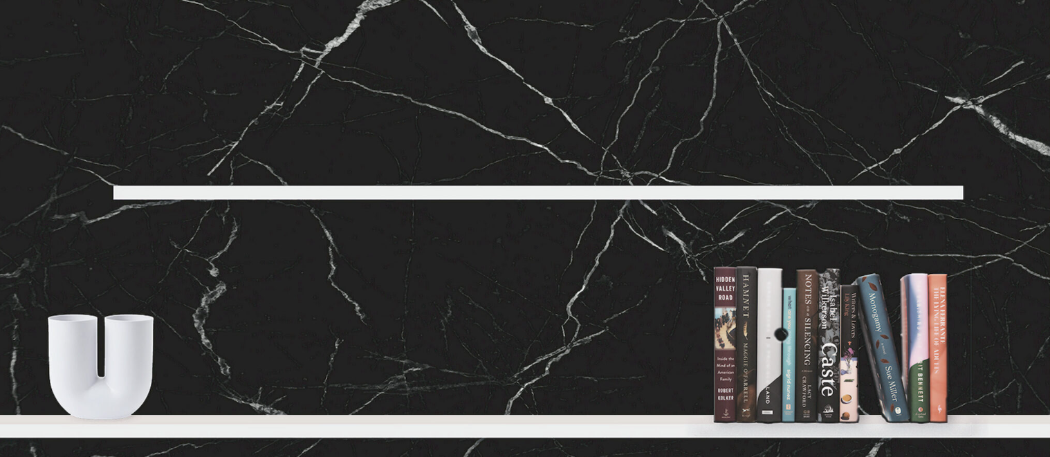 Con un panel posterior con efecto mármol negro, esta estantería cuenta con dos estantes escalonados lacados en blanco marfil, creando un sofisticado contraste visual.