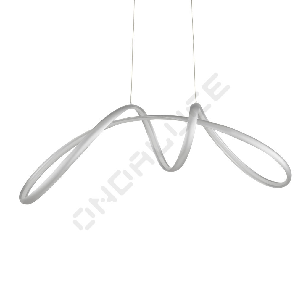 Suspensión moderna y lineal, con estructura de metal plateado. Fuente de luz LED, difusor en material polimérico.