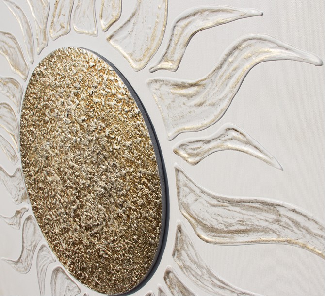 Estructura de lona lacada en marfil y decorada a mano con acabado texturizado en relieve y elemento central en pan de plata.