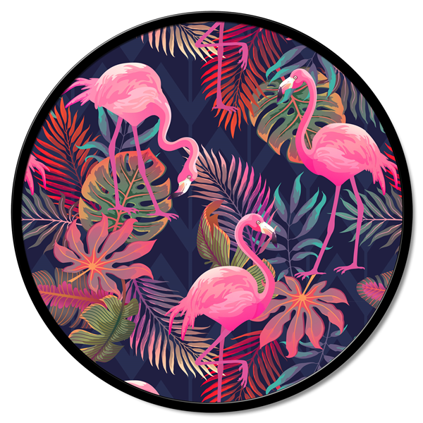 Panel redondo de fibra de madera recubierto de lona de puro algodón estampado en alta definición y con estructura de metal lacado mate.