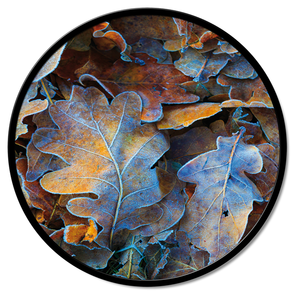 Panel redondo de fibra de madera recubierto de lona de puro algodón estampado en alta definición y con estructura de metal lacado mate.