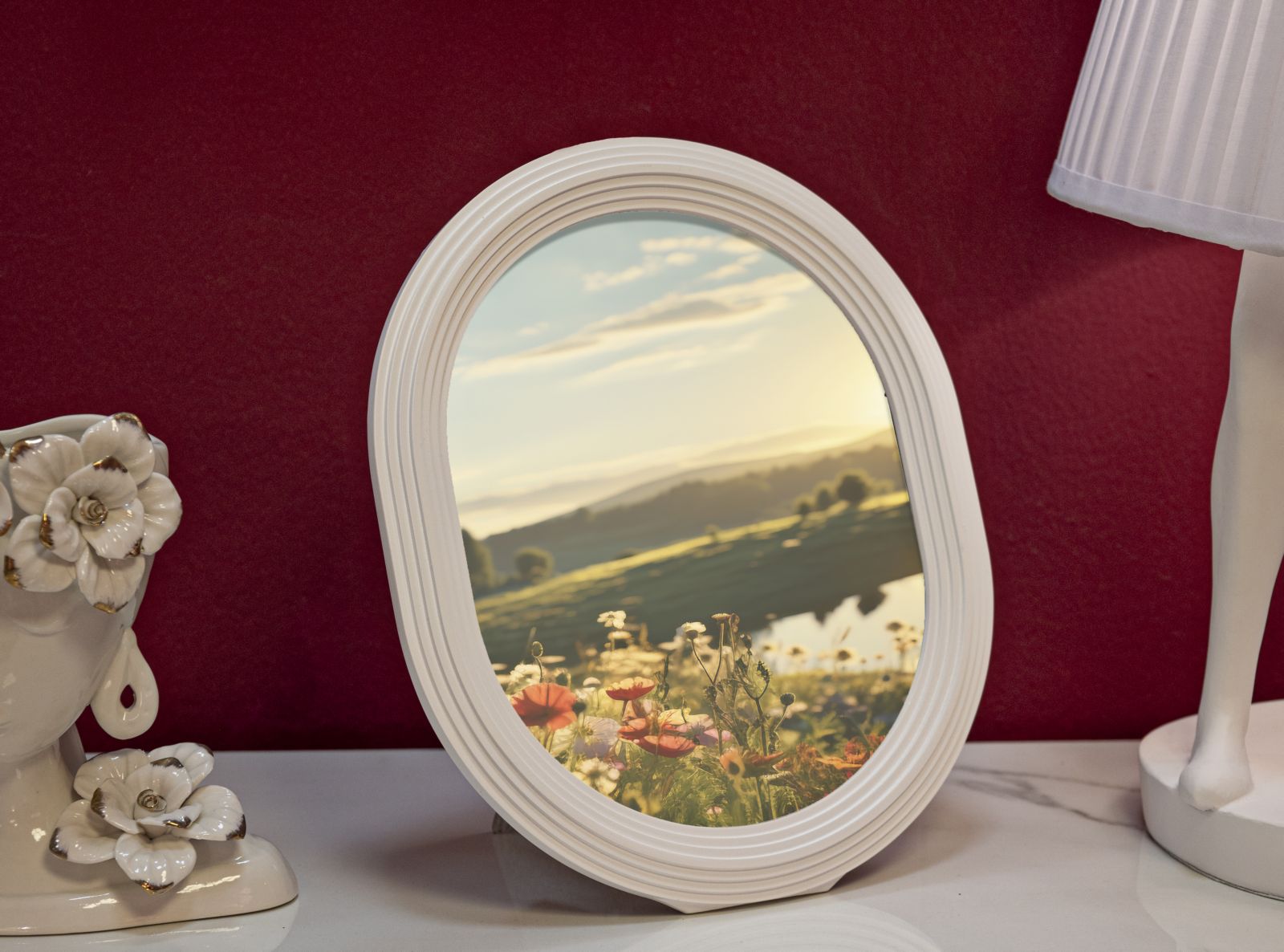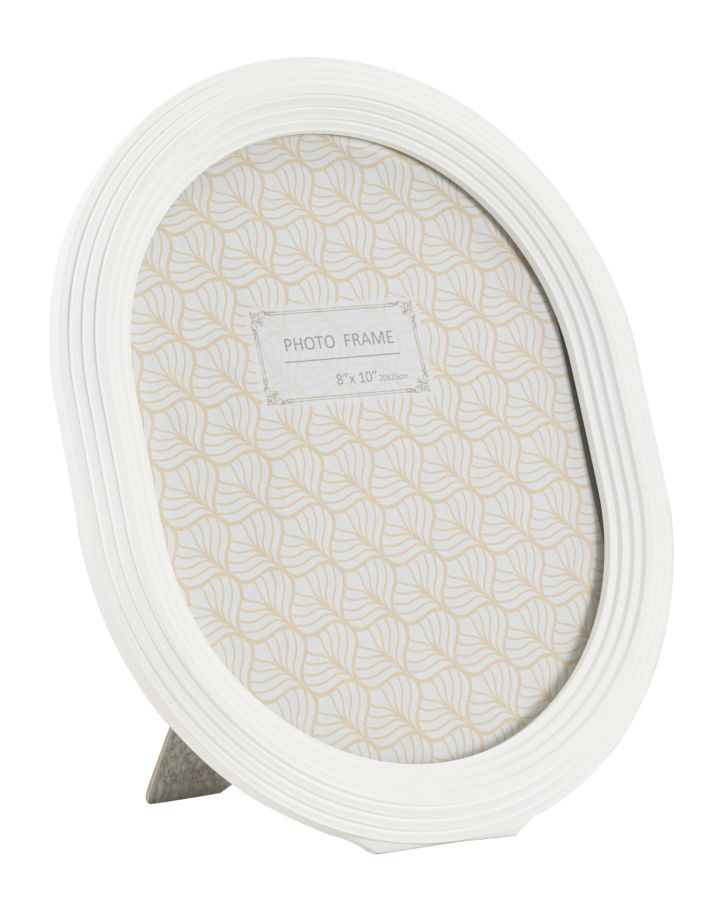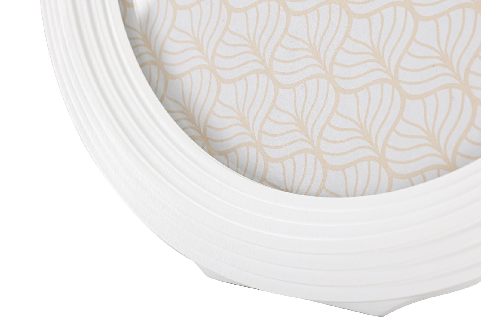 Estructura exenta ovalada de resina blanca con un diseño sencillo y lineal. Dimensiones de la foto 20x25 cm.