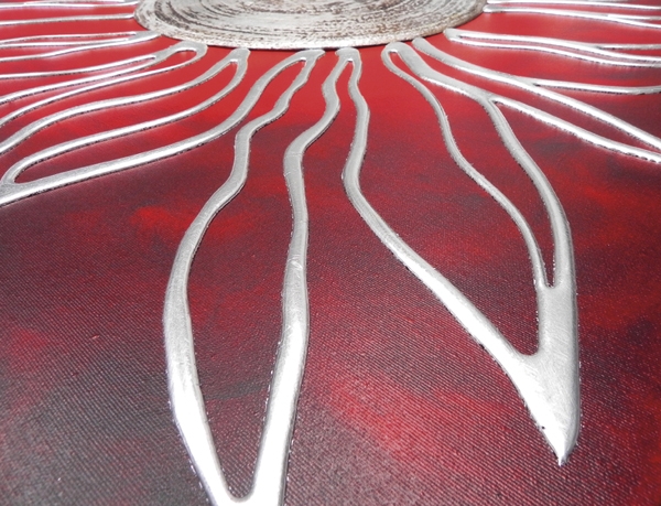 Elementos en relieve decorados a mano con resinas, material, pan de plata sobre estructura de lino, acabado brillante.