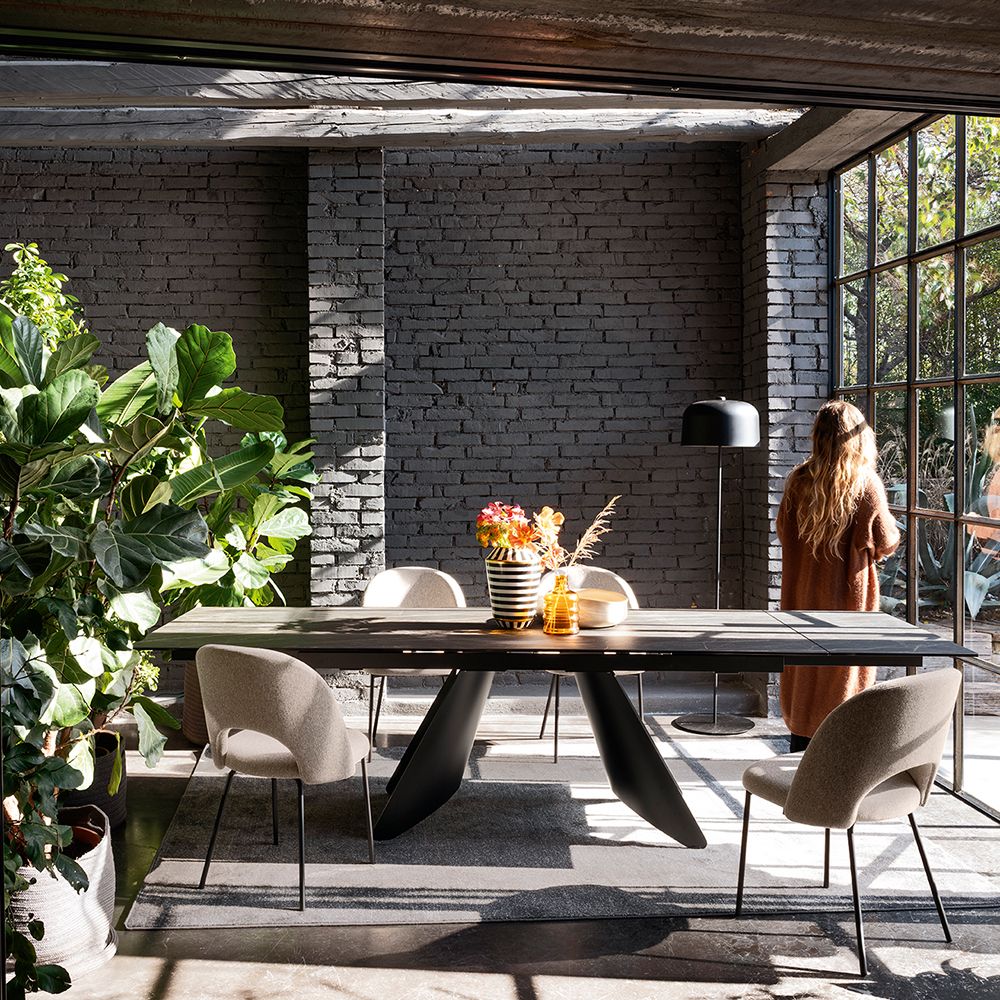 La colección de mesas Orion aporta al comedor una fuerte personalidad y un diseño distintivo.