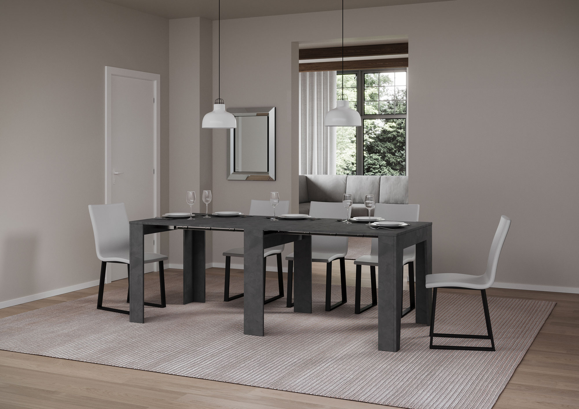 Consola extensible Narrow, versátil y resistente, un complemento perfecto para cualquier ambiente del hogar: entrada, cocina, comedor, sala de estar o pasillo. La consola extensible Narrow se transforma en una mesa de comedor extendendose hasta 181 cm, puede acomodar 8 personas. Hecha de paneles de melamina. El sistema de extensión con guías telescópicas de aluminio y el soporte central incluido hacen que la consola sea estable y resistente. Cuando la consola está cerrada, las extensiones deben almacenarse en otro lugar. Producto Itamoby Made in Italy Dimensión: Consola cerrada: L.90 A.25 AL.77 cm Longitud con 1 extensión: 77 cm Longitud con 2 extensiones: 129 cm Longitud con 3 extensiones: 181 cm