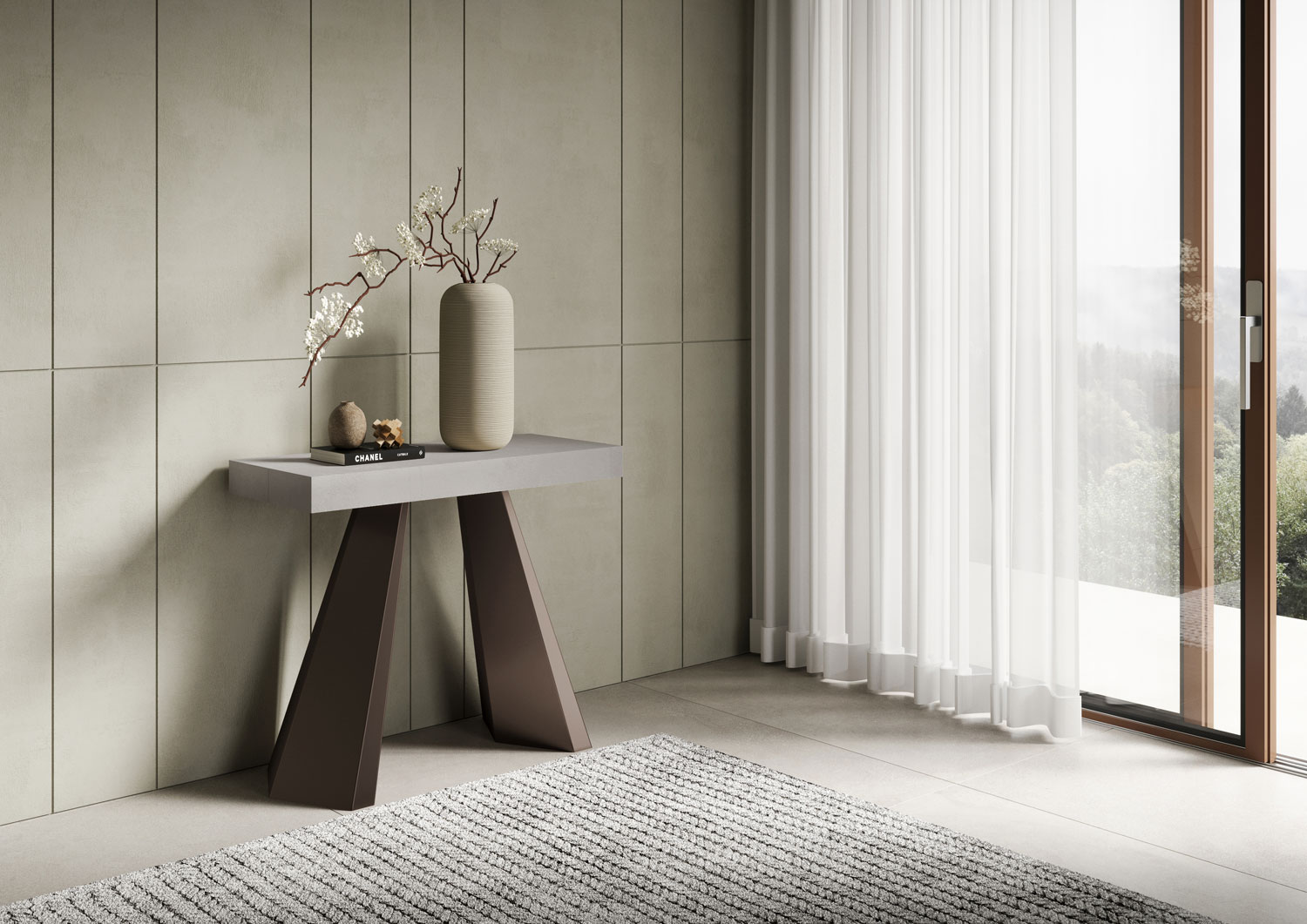 Consola extensible Diamante Small, versátil y resistente, un complemento perfecto para cualquier ambiente del hogar: entrada, cocina, comedor, sala de estar o pasillo. La consola extensible Diamante Small se transforma en una mesa de comedor extendendose hasta 196 cm, puede acomodar 10 personas. Hecha de paneles de melamina con patas en hierro. El sistema de extensión con guías telescópicas de aluminio y los soportes laterales incluidos hacen que la consola sea estable y resistente. Cuando la consola está cerrada, las extensiones deben almacenarse en otro lugar. Producto Itamoby Made in Italy Dimensión: Consola cerrada: L.90 A.40 AL.77 cm Longitud con 1 extensión: 92 cm Longitud con 2 extensiones: 144 cm Longitud con 3 extensiones: 196 cm