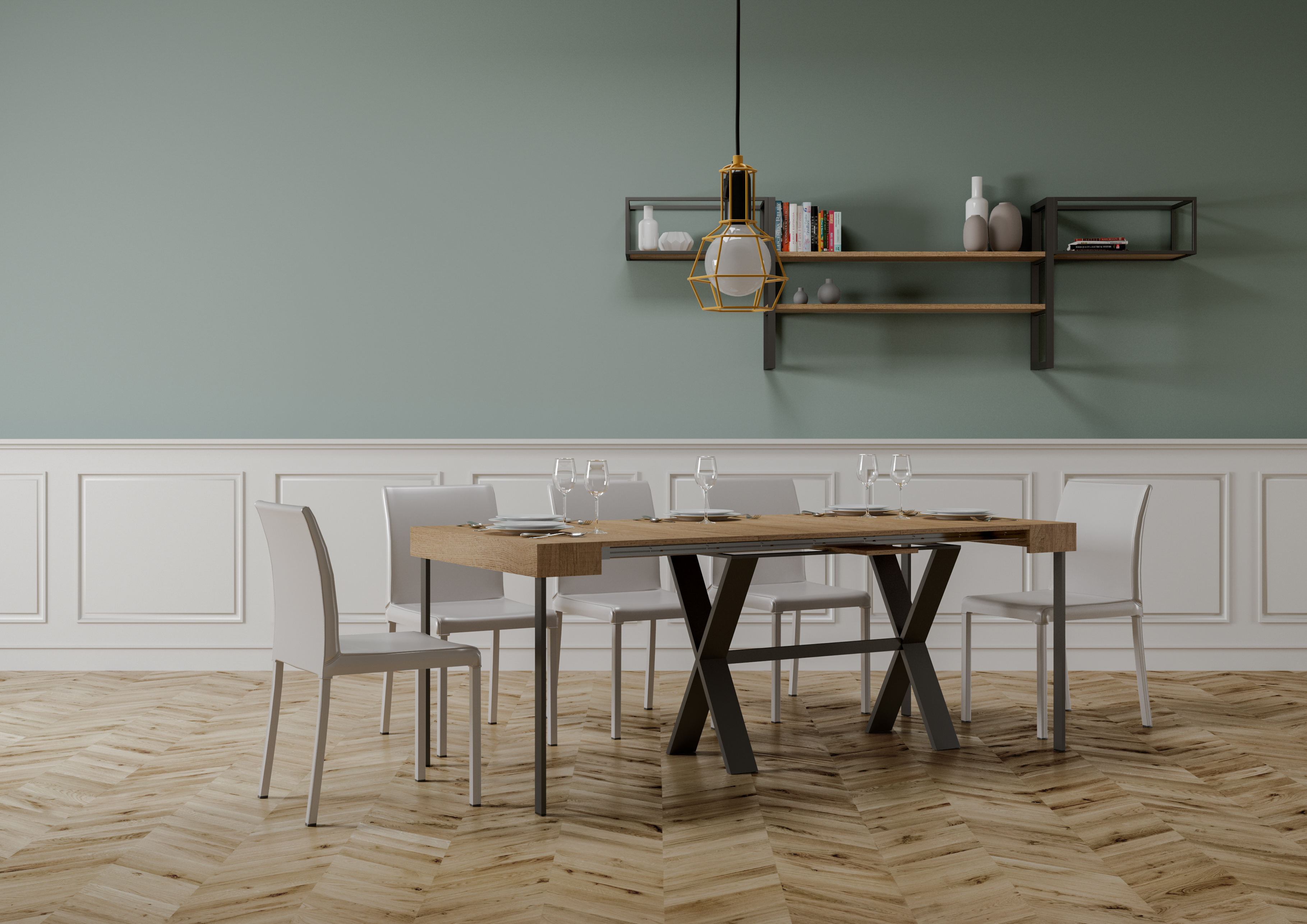 La consola extensible Xenia Small es versátil y robusta, lo que la convierte en el complemento perfecto para cualquier estancia del hogar: recibidor, cocina, comedor, salón o pasillo. Se transforma fácilmente en una gran mesa de comedor de hasta 196 cm de largo, con capacidad para 10 personas. Fabricada con paneles revestidos de melamina y patas de hierro. El sistema de extensión con guías telescópicas de aluminio y los soportes laterales incluidos la hacen estable y robusta. Una vez cerrada, las extensiones deben guardarse. Producto Itamoby, fabricado en Italia. Dimensiones: Consola cerrada: An. 90 cm Pr. 40 cm Al. 77 cm. Largo con 1 extensión: 92 cm. Largo con 2 extensiones: 144 cm. Largo con 3 extensiones: 196 cm.