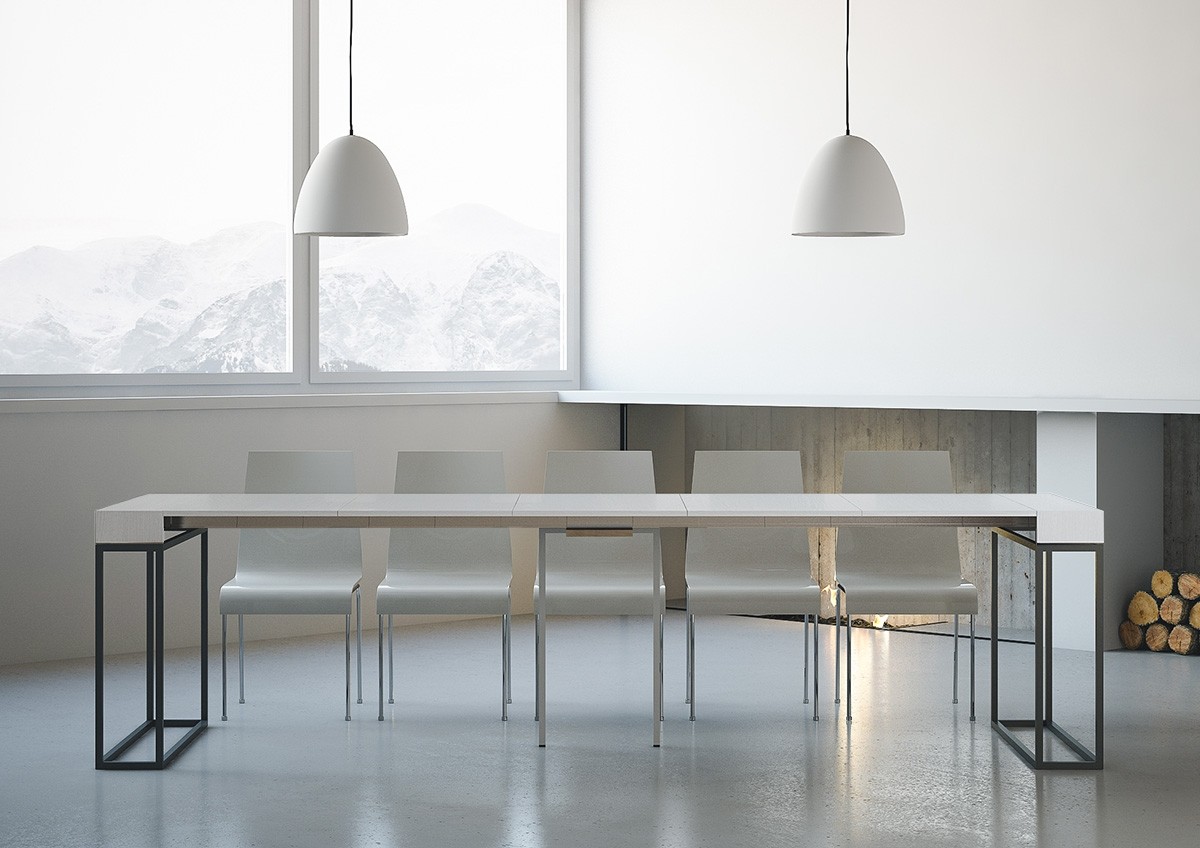 La consola extensible Epoca es versátil y robusta, lo que la convierte en el complemento perfecto para cualquier estancia del hogar: recibidor, cocina, comedor, salón o pasillo. Se transforma fácilmente en una gran mesa de comedor de hasta 300 cm de largo, con capacidad para 14 personas. Fabricada con paneles de melamina y patas de hierro. El sistema de extensión con guías telescópicas de aluminio y el soporte central incluido la hacen estable y robusta. Una vez cerrada, las extensiones deben guardarse. Itamoby. Fabricada en Italia. Dimensiones: Consola cerrada: An. 90 Pr. 40 Al. 77 cm. Largo con 1 extensión: 92 cm. Largo con 2 extensiones: 144 cm. Largo con 3 extensiones: 196 cm. Largo con 4 extensiones: 248 cm. Largo con 5 extensiones: 300 cm.
