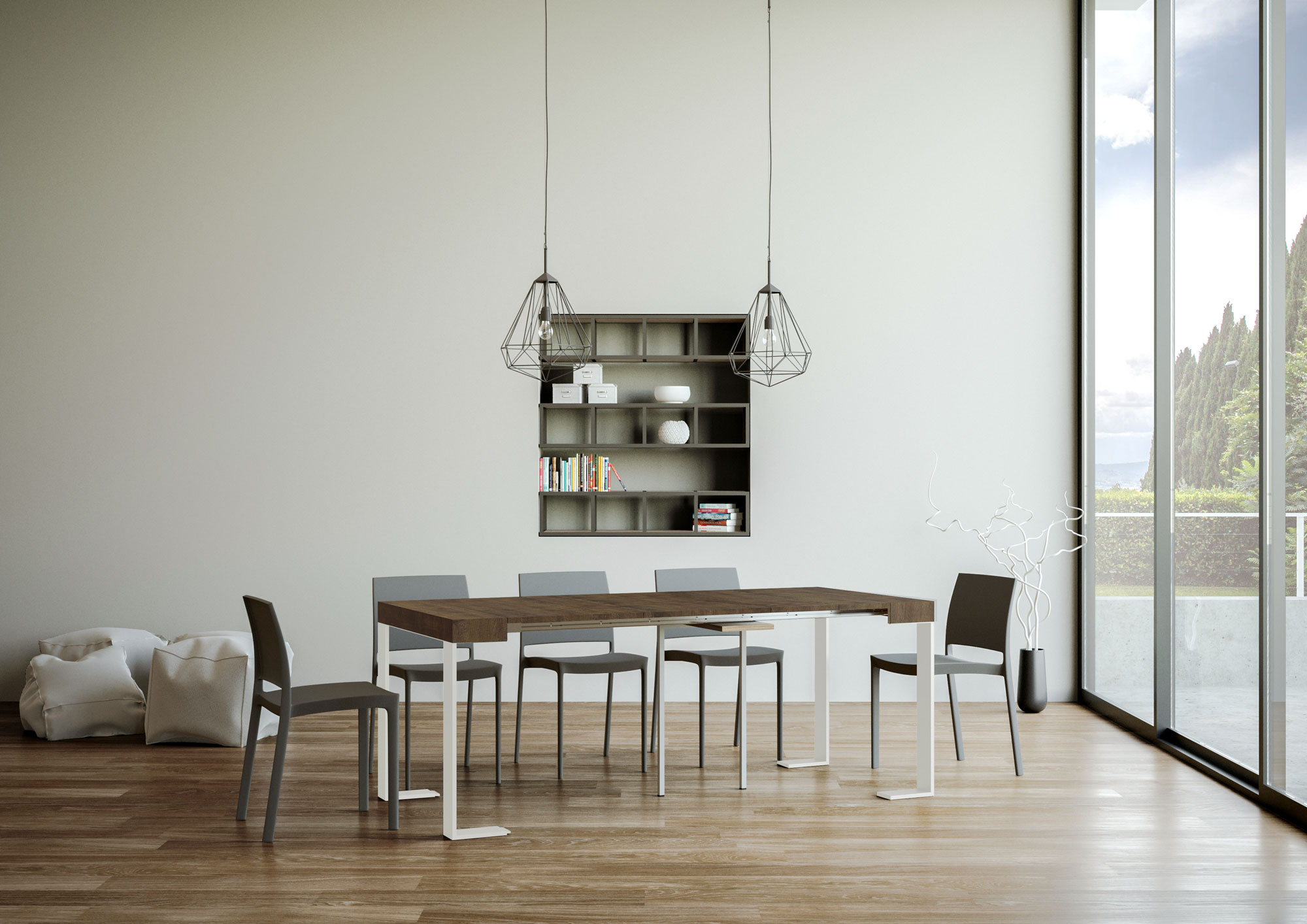 Consola extensible Tecno, versátil y resistente, un complemento perfecto para cualquier ambiente del hogar: entrada, cocina, comedor, sala de estar o pasillo. La consola extensible Tecno se transforma en una mesa de comedor extendendose hasta 300 cm, puede acomodar 14 personas. Hecha de paneles de melamina con patas en hierro. El sistema de extensión con guías telescópicas de aluminio y el soporte central incluido hacen que la consola sea estable y resistente. Cuando la consola está cerrada, las extensiones deben almacenarse en otro lugar. Producto Itamoby Made in Italy Dimensión: Consola cerrada: L.90 A.40 AL.77 cm Longitud con 1 extensión: 92 cm Longitud con 2 extensiones: 144 cm Longitud con 3 extensiones: 196 cm Longitud con 4 extensiones: 248 cm Longitud con 5 extensiones: 300 cm