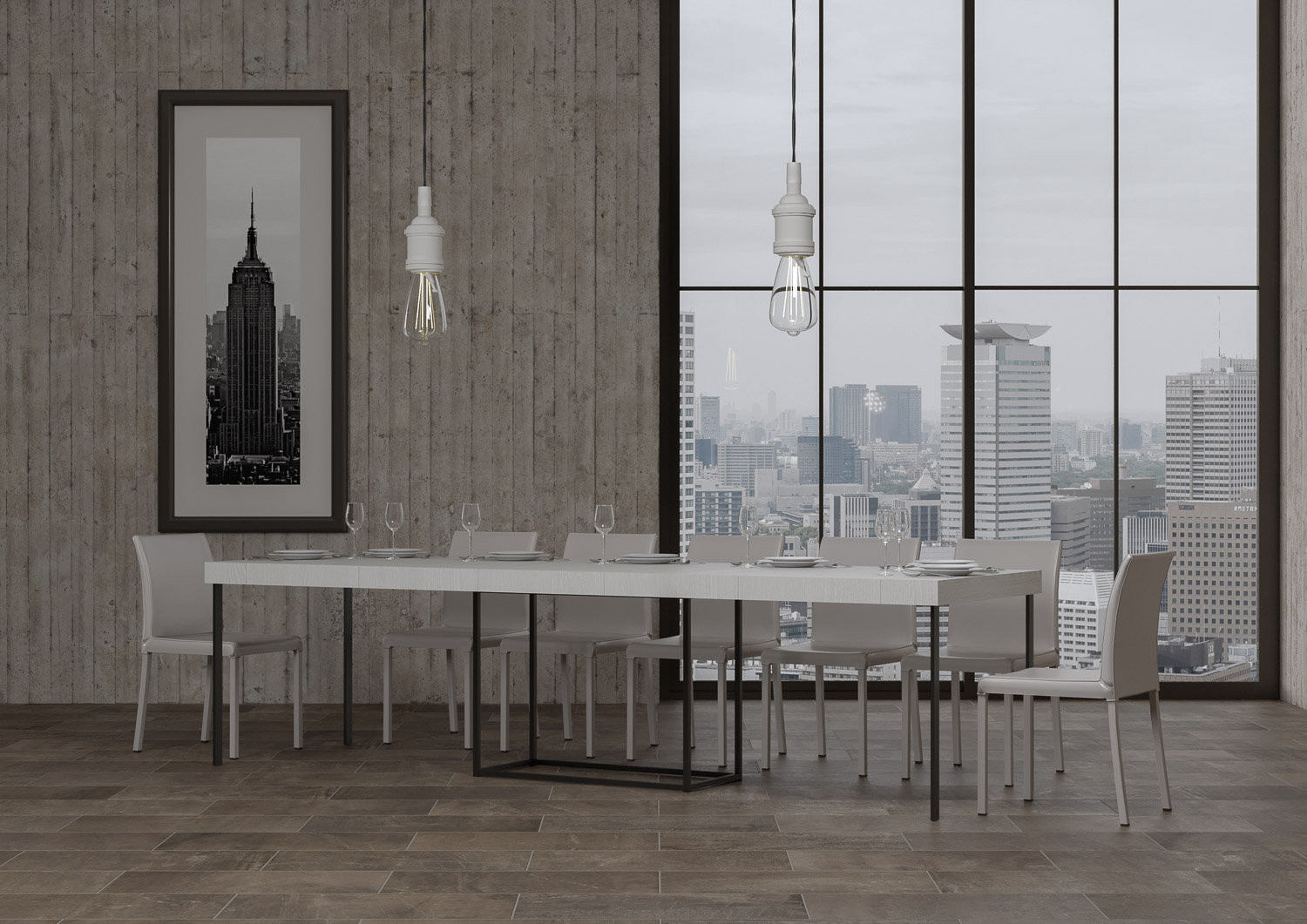 La consola extensible Nordica Premium es versátil y robusta, lo que la convierte en el complemento perfecto para cualquier estancia del hogar: recibidor, cocina, comedor, salón o recibidor. Se transforma fácilmente en una gran mesa de comedor de hasta 300 cm de largo, con capacidad para 14 personas. Fabricada con paneles revestidos de melamina y patas de hierro. El sistema de extensión con guías telescópicas de aluminio y los soportes laterales incluidos la hacen estable y robusta. Una vez cerrada, las extensiones deben guardarse. Producto Itamoby, fabricado en Italia. Dimensiones: Consola cerrada: An. 90 Pr. 40 Al. 77 cm. Largo con 1 extensión: 92 cm. Largo con 2 extensiones: 144 cm. Largo con 3 extensiones: 196 cm. Largo con 4 extensiones: 248 cm. Largo con 5 extensiones: 300 cm.