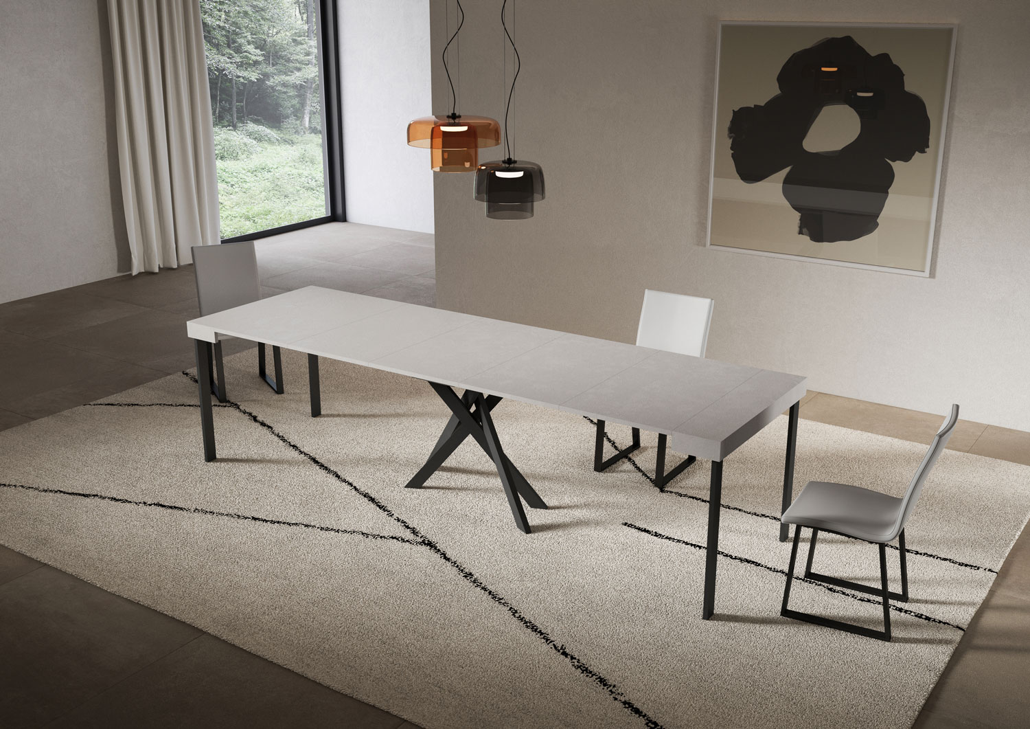 Consola extensible Saki , versátil y resistente, un complemento perfecto para cualquier ambiente del hogar: entrada, cocina, comedor, sala de estar o pasillo. La consola extensible Saki se transforma en una mesa de comedor extendendose hasta 300 cm, puede acomodar 14 personas. Hecha de paneles de melamina con patas en hierro. El sistema de extensión con guías telescópicas de aluminio y los soportes laterales incluidos hacen que la consola sea estable y resistente. Cuando la consola está cerrada, las extensiones deben almacenarse en otro lugar. Producto Itamoby Made in Italy Dimensión: Consola cerrada: L.90 A.40 AL.77 cm Longitud con 1 extensión: 92 cm Longitud con 2 extensiones: 144 cm Longitud con 3 extensiones: 196 cm Longitud con 4 extensiones: 248 cm Longitud con 5 extensiones: 300 cm