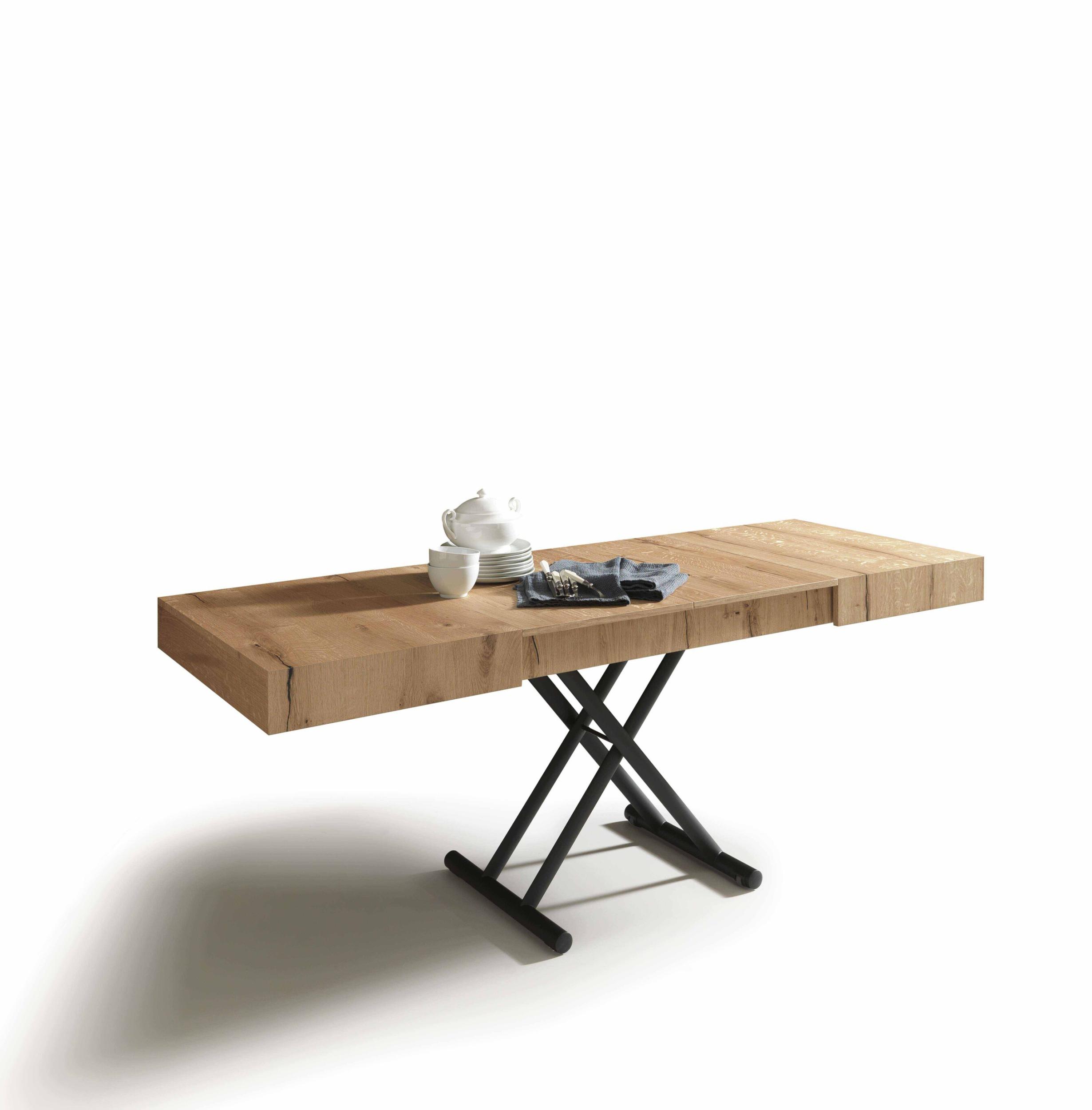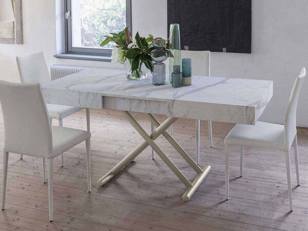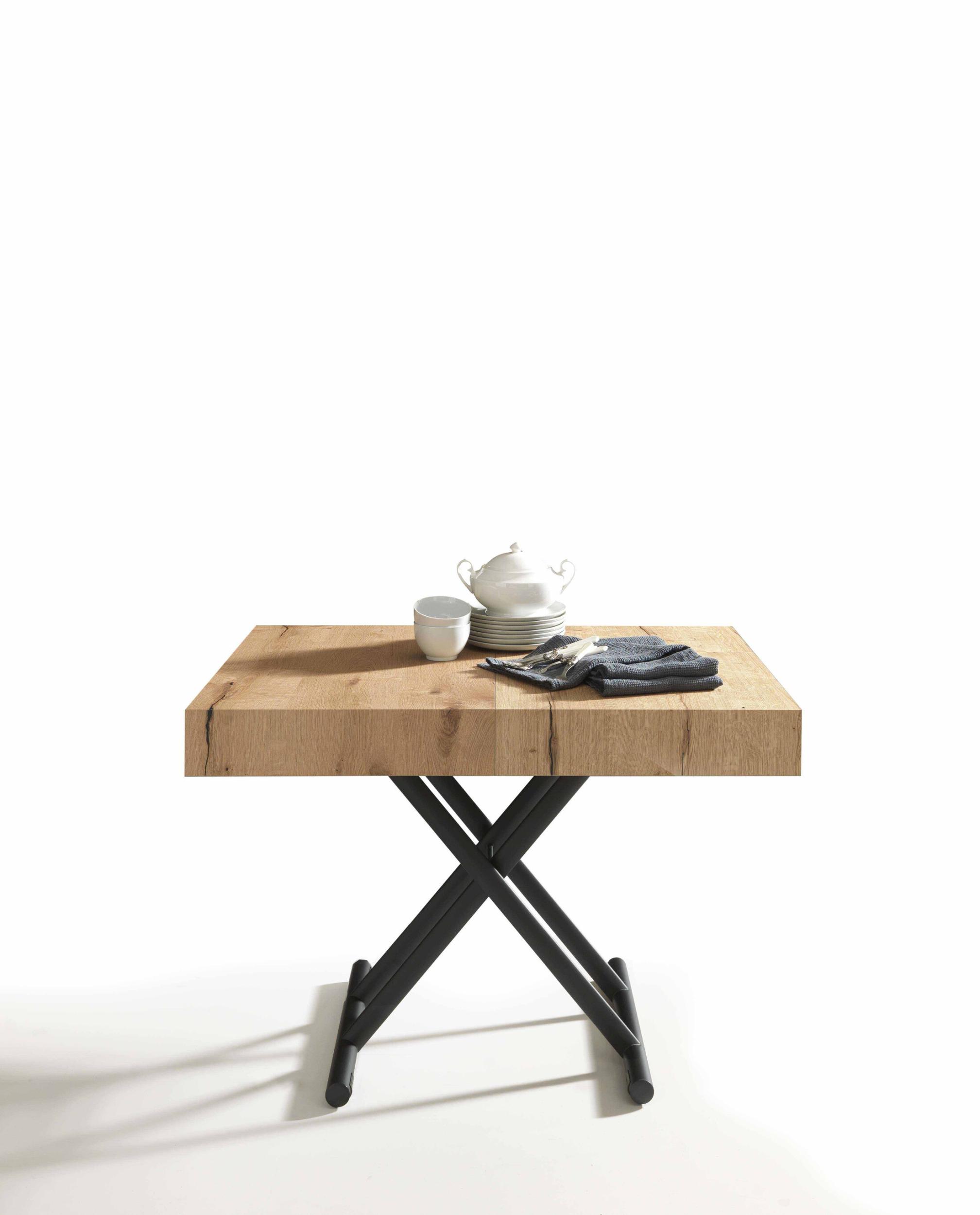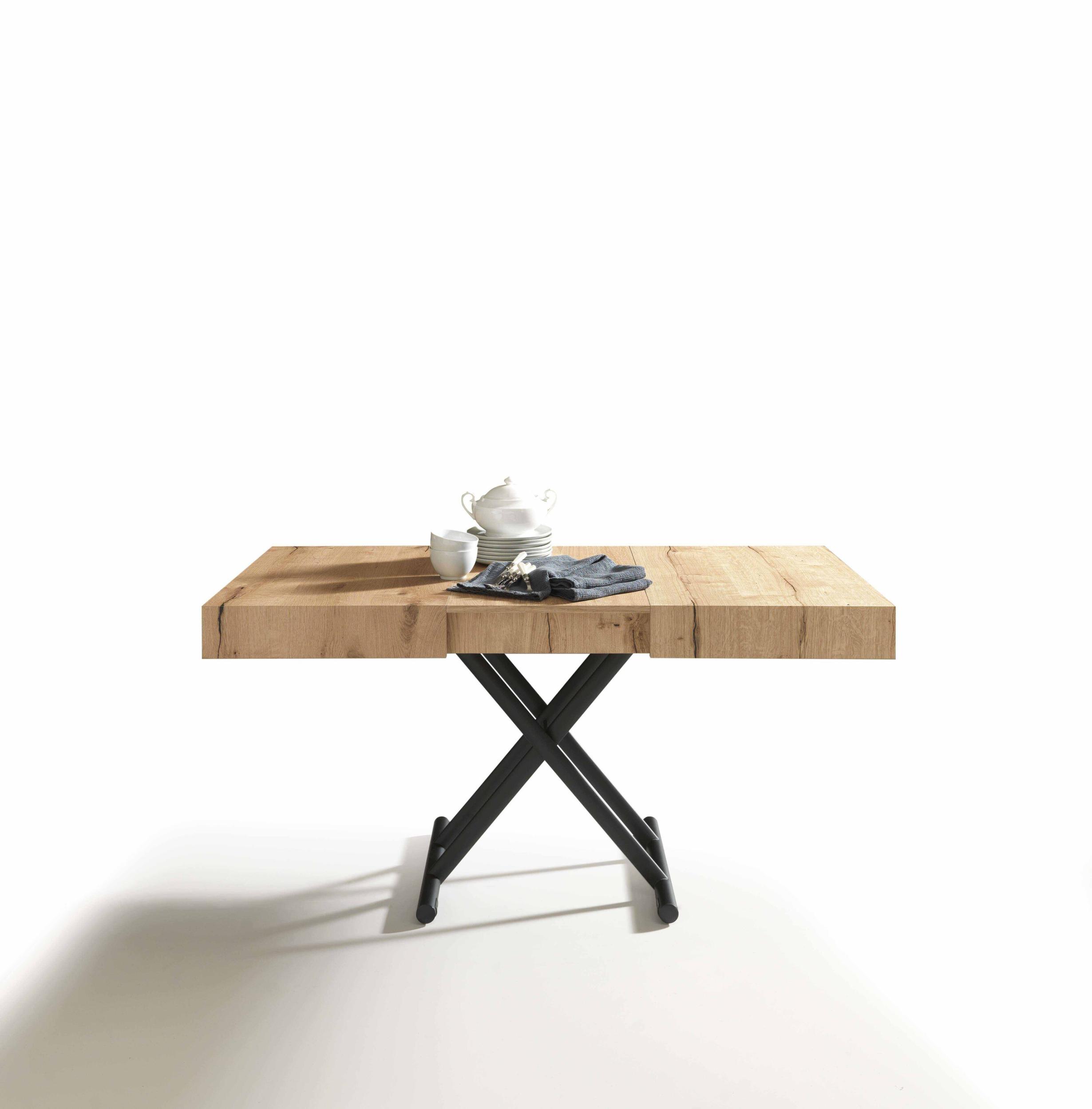 Mesa de centro convertible en mesa de comedor, base de metal, mecanismo de gas, altura regulable al milímetro de 28 cm a 80 cm, tablero rectangular en melamina, lacado, efecto madera o mortero.