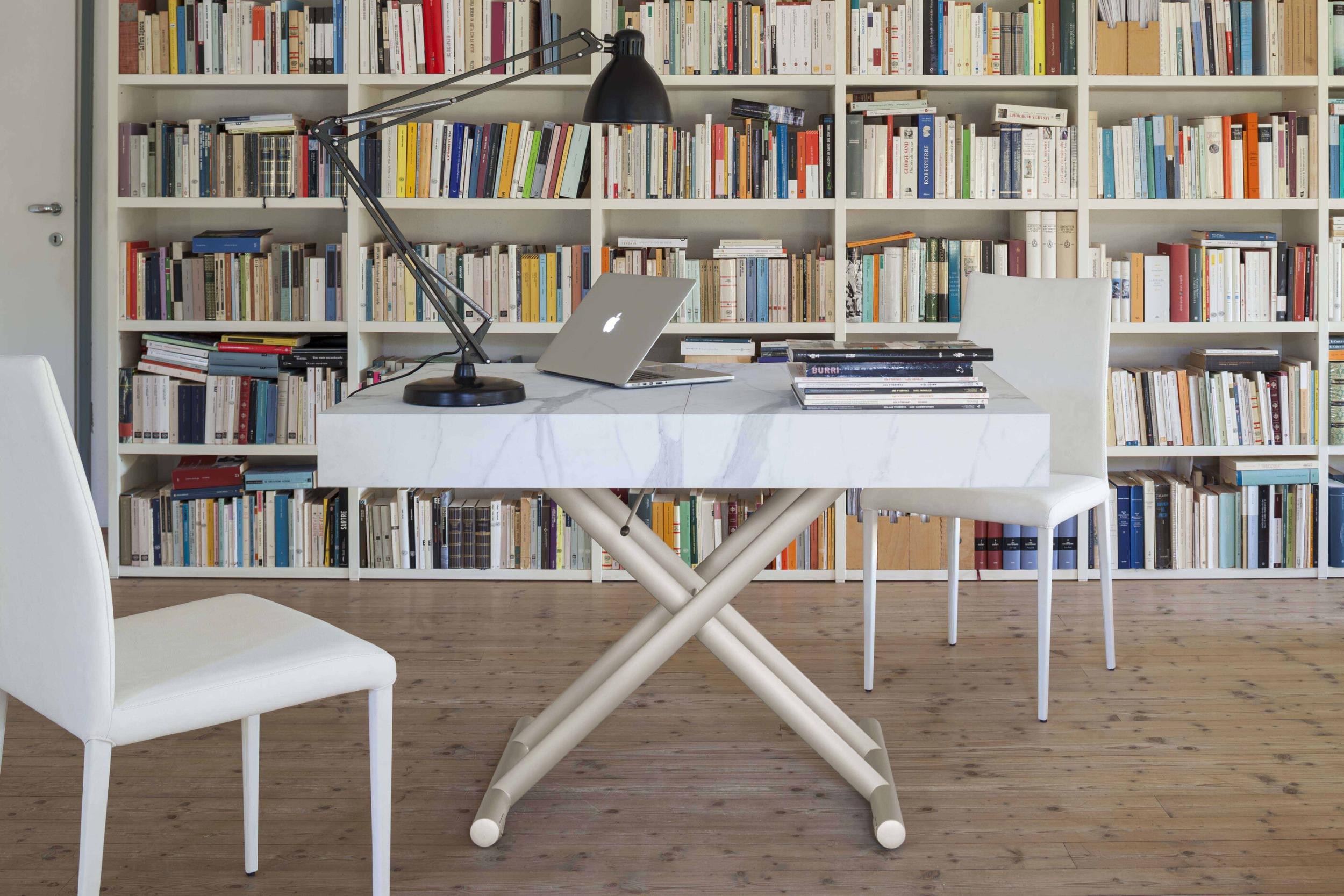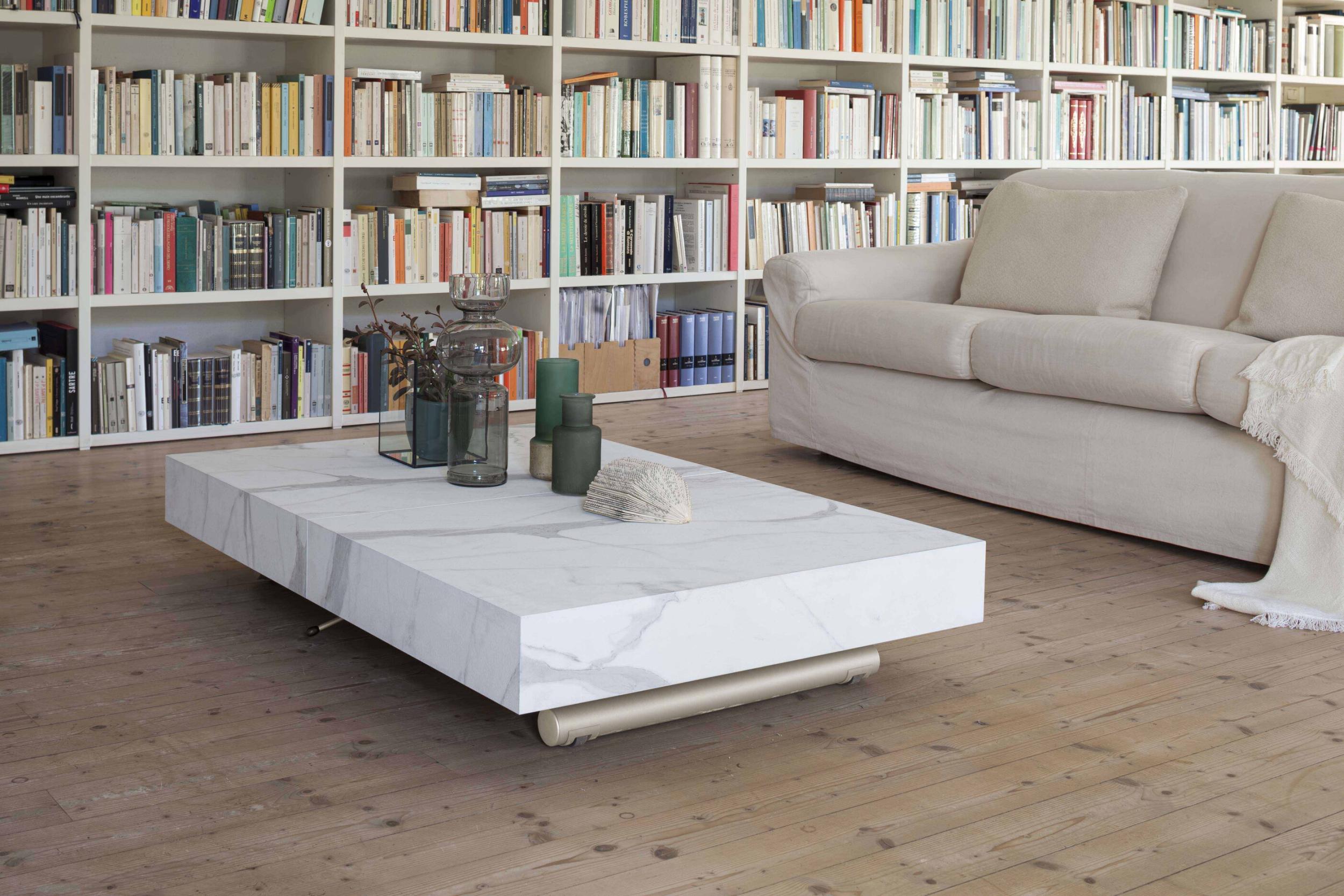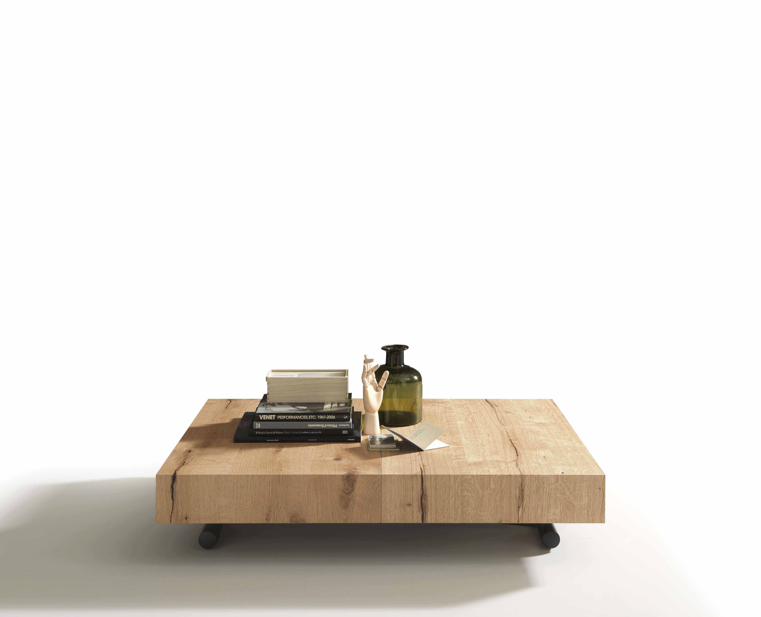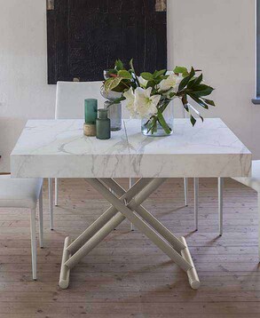 Mesa de centro convertible en mesa de comedor, base de metal, mecanismo de gas, altura regulable al milímetro de 28 cm a 80 cm, tablero rectangular en melamina, lacado, efecto madera o mortero.