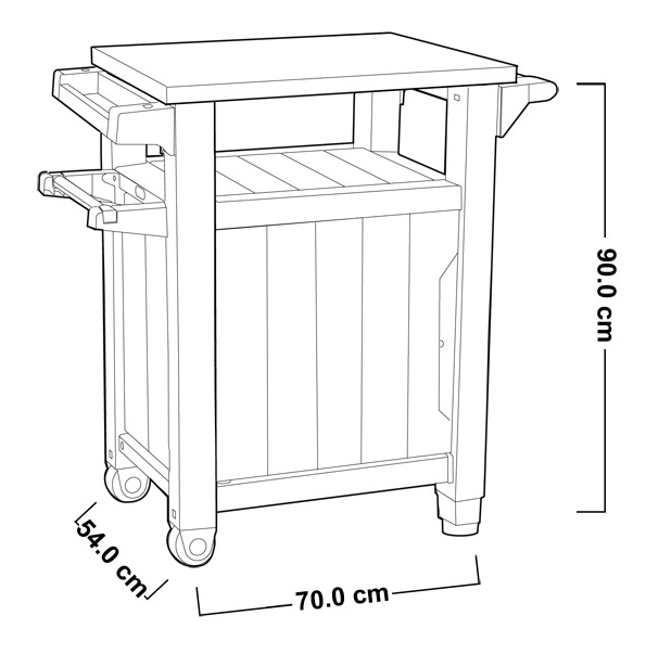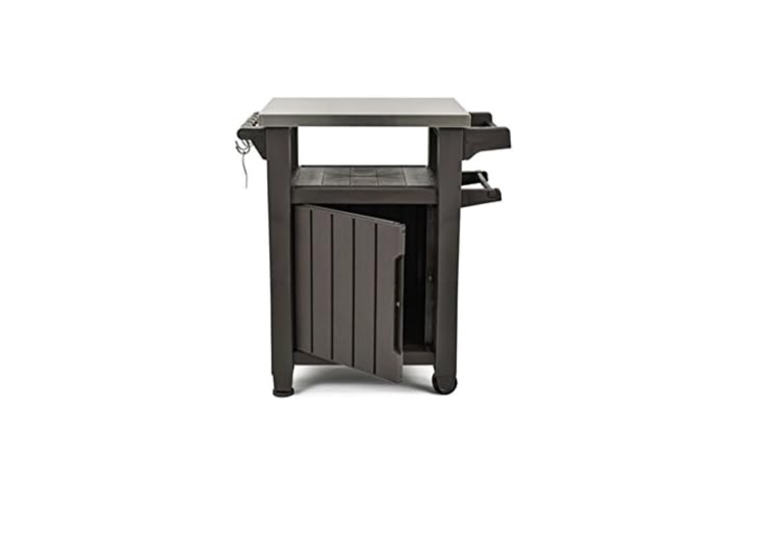 Gracias al compartimento de almacenamiento y a los accesorios integrados como el portarrollos, el abridor de botellas y los ganchos para utensilios, es perfecto para organizar todo lo que necesitas en un solo espacio.
