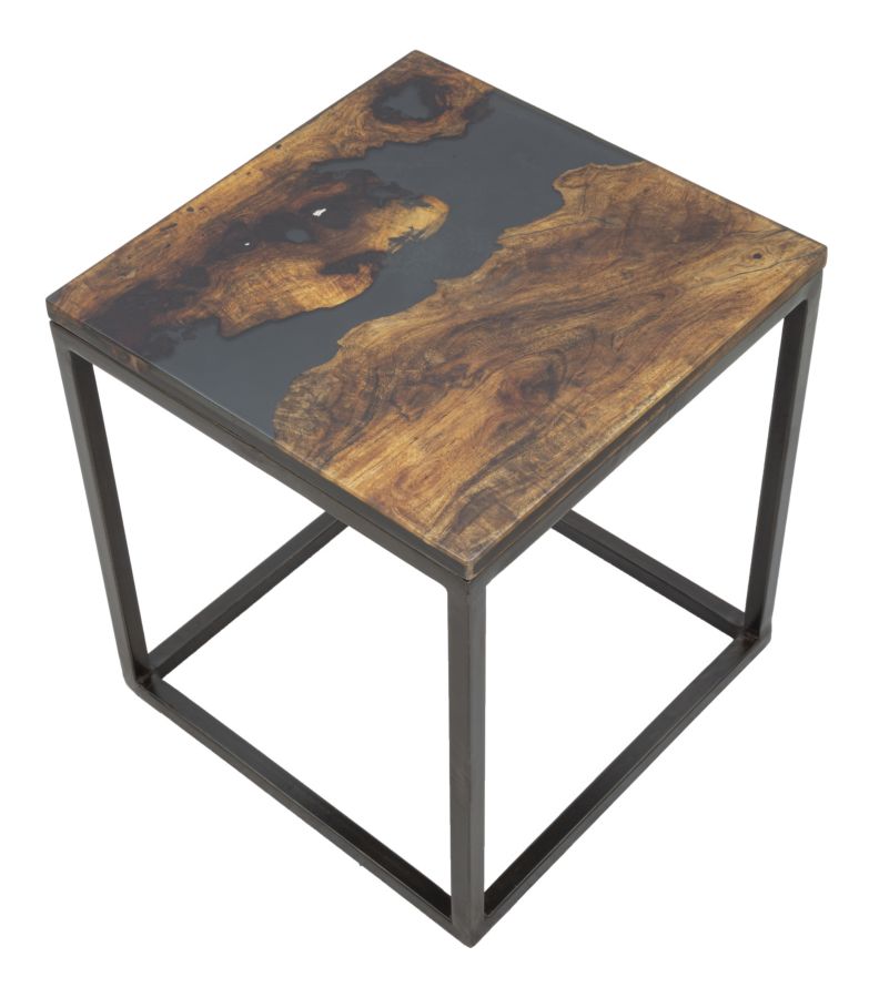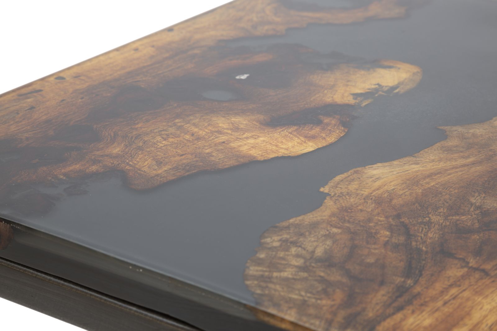 Elegante mesa de centro cuadrada con tapa de madera maciza de acacia y estructura de metal negro. La particular elaboración con resina engastada en la tapa da un toque de color y modernidad a una pieza extremadamente elegante y clásica.