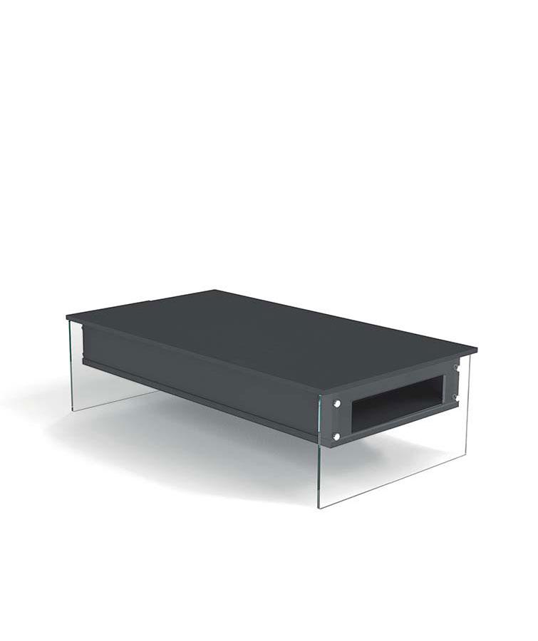Fabricada en laminado ecológico de 18 y 25 mm y con laterales de cristal templado de 10 mm de espesor, esta mesa de centro combina elegancia y funcionalidad.