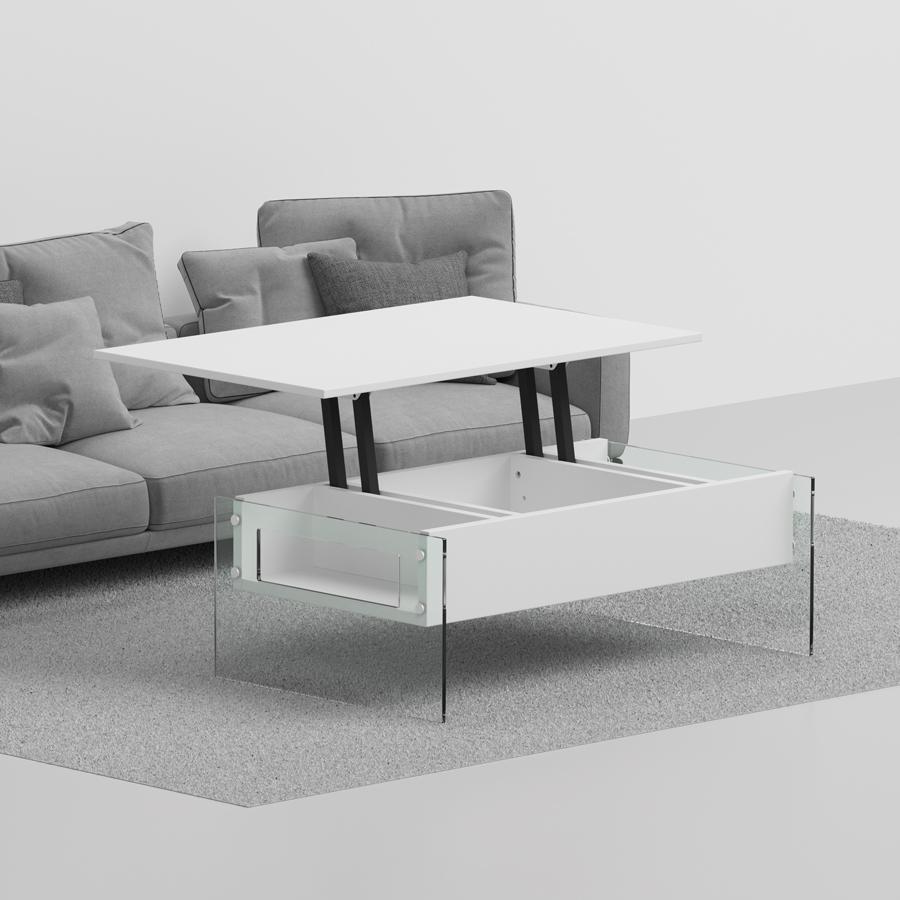 Mesa de centro multifuncional con tapa elevable que esconde un práctico contenedor.