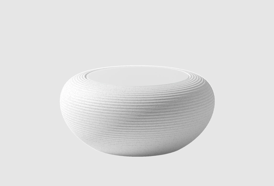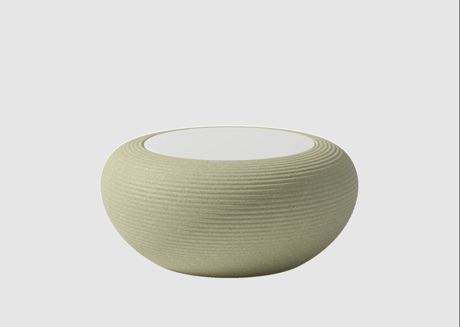 Nami es una mesa redonda con cuerpo de polietileno reciclable y tablero de cristal pintado.