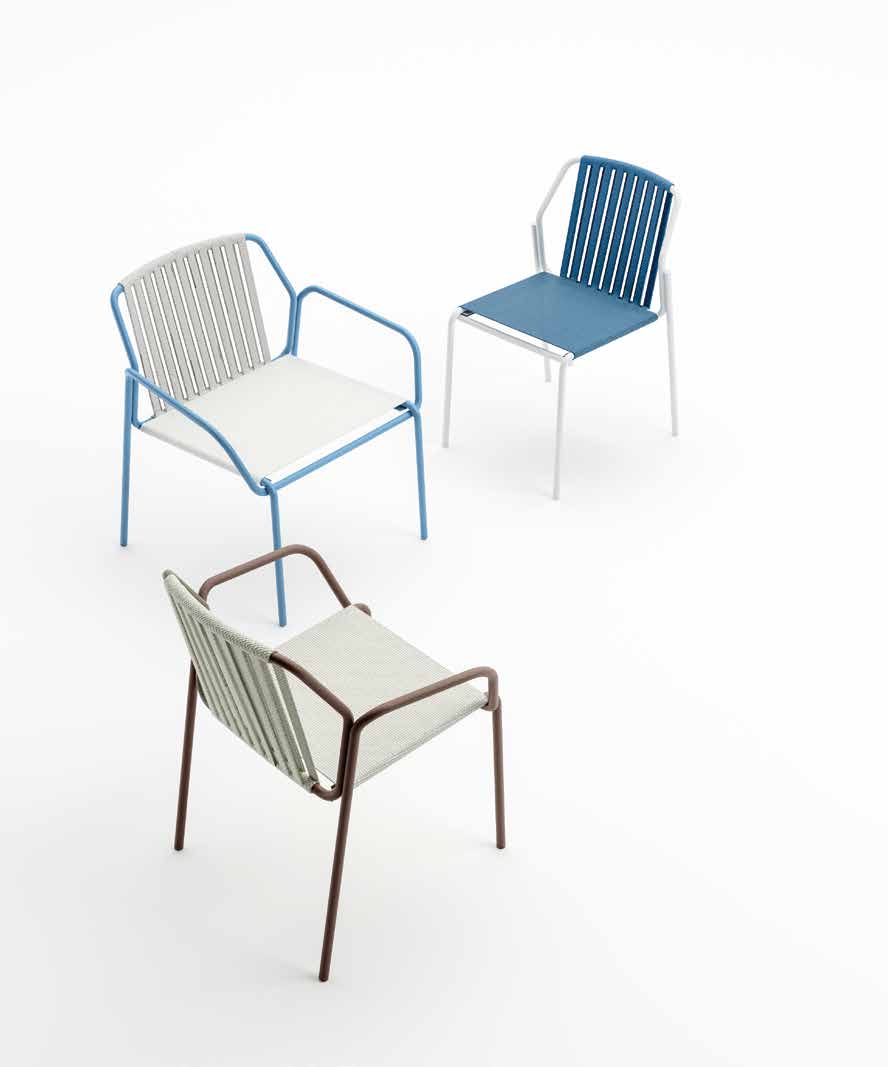 El asiento se caracteriza por una membrana Batyline, ligera, elegante, resistente a los rayos UV, al moho, a la intemperie, reciclable y fácilmente reemplazable.