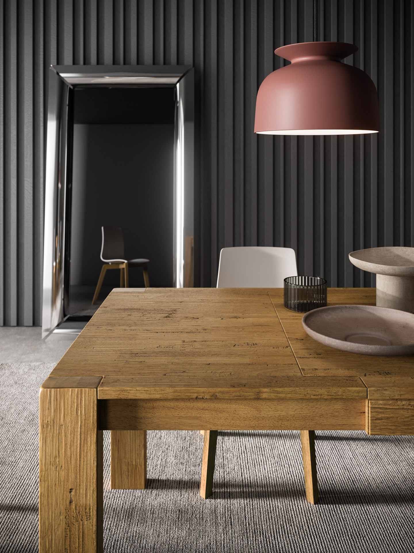 La mesa MOOD destaca por sus patas cuadradas de generosas dimensiones, que resaltan la cabeza de la madera y confieren a la mesa un aspecto decidido y primordial. Las inserciones de la parte superior recuerdan las antiguas técnicas de unión de los maestros ebanistas, añadiendo un elemento de artesanía y carácter único.