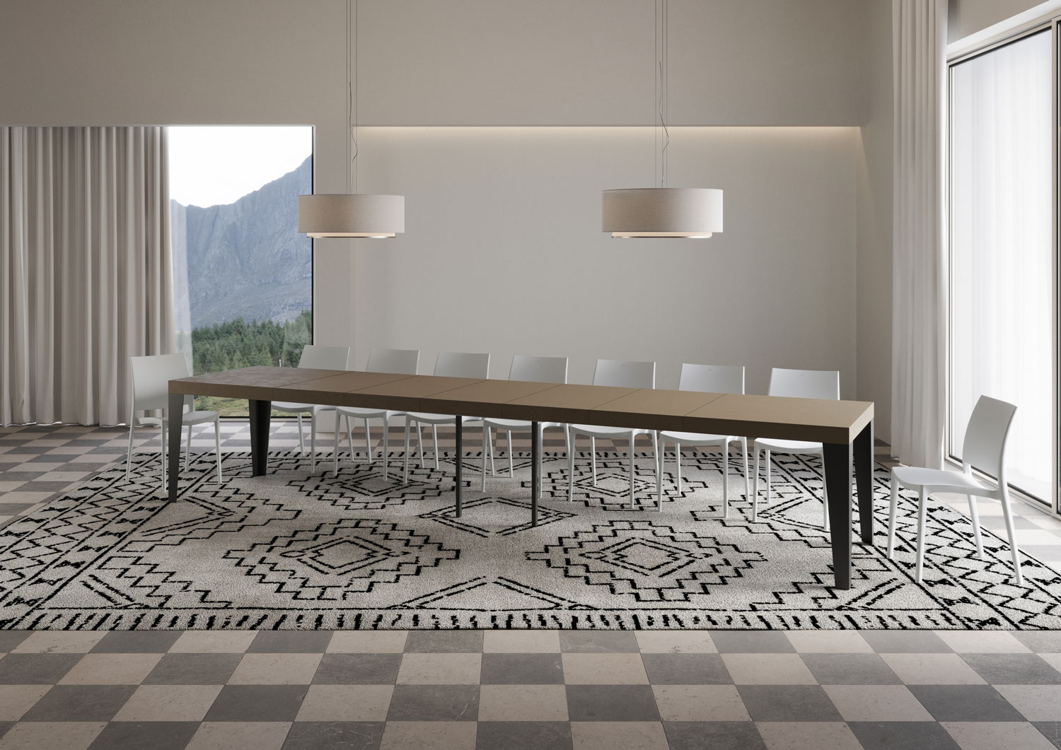 Mesa extensible Flame Premium 160, con diseño lineal, sencillo y esencial, se adapta a cualquier estilo de decoración y se revela ideal tanto como mesa de comedor como elemento de decoración para la sala de estar, donde recibir a los invitados con estilo. La mesa extensible Flame Premium puede extenderse progresivamente hasta 420 cm y puede acomodar 18 personas. Hecha con paneles de melamina, patas en hierro, tapa y extensiones trabajadas con proceso miter folding. El sistema de extensión con guías telescópicas de aluminio hacen que la mesa sea estable y robusta también cuando totalmente extendida, sin que necesite ningún soporte adicional. Cuando no se utilizan, las extensiones no encuentran espacio al interno de la estructura y deben ser almacenadas en otro lugar. Producto Itamoby Made in Italy Dimensiones: Mesa cerrada: L.160 A.90 AL.77 cm Longitud con 1 extensión: 212 cm Longitud con 2 extensiones: 264 cm Longitud con 3 extensiones: 316 cm Longitud con 4 extensiones: 368 cm Longitud con 5 extensiones: 420 cm