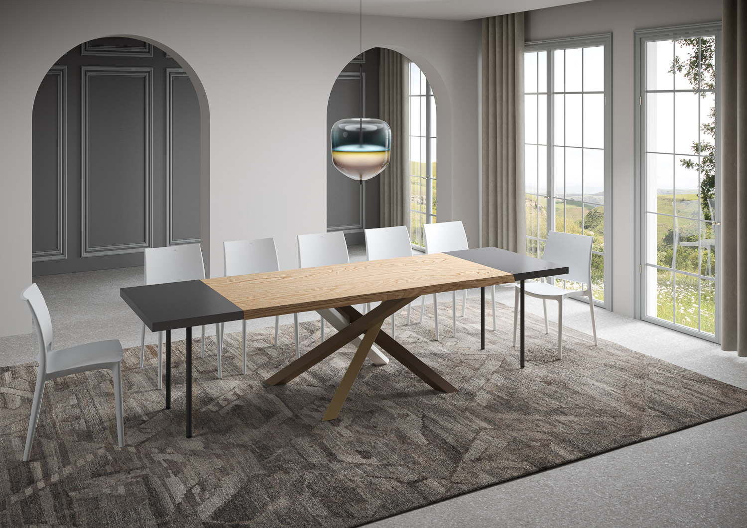 La mesa extensible Versalux de 200 cm, con su sofisticado diseño moderno, se adapta a cualquier estilo de decoración y es la opción ideal tanto para el comedor como para el salón, donde podrá recibir a sus invitados con estilo. La mesa extensible Versalux se extiende hasta 300 cm y tiene capacidad para 12 personas. Fabricada con tablero de chapa de roble, madera maciza en los cuatro lados y descortezada en los largos, hojas extensibles de madera alveolar y patas de hierro pintado. Las hojas extensibles de color antracita evitan variaciones de color con el tablero de madera, que puede cambiar de color con el tiempo debido a la exposición a la luz. El uso de hojas extensibles del mismo color podría crear diferencias visuales, mientras que el color antracita garantiza una apariencia uniforme y duradera. Las hojas extensibles no caben dentro de la mesa y deben guardarse en otro lugar. Grosor del tablero y las extensiones: 5 cm. Producto Itamoby. Hecho en Italia. Dimensiones: Mesa cerrada: L.200 P.90 H.75 cm. Largo con 1 extensión: 250 cm. Largo con 2 extensiones: 300 cm.