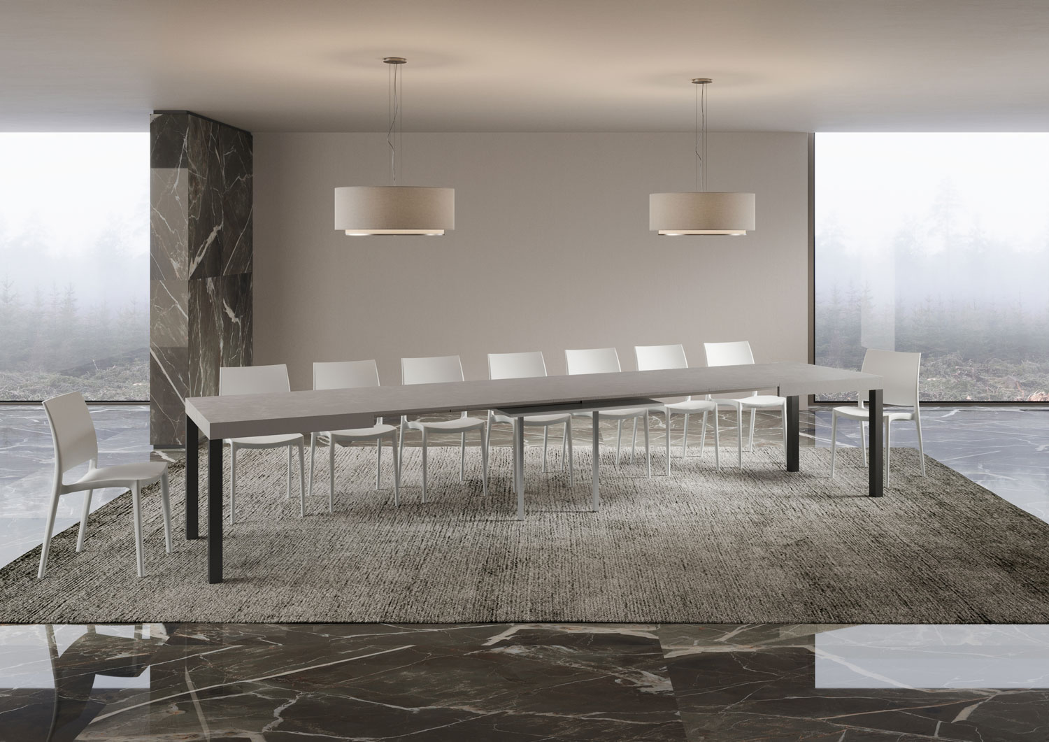 Mesa extensible Everyday 160, con diseño lineal, sencillo y esencial, se adapta a cualquier estilo de decoración y se revela ideal tanto como mesa de comedor como elemento de decoración para la sala de estar, donde recibir a los invitados con estilo. La mesa extensible Everyday puede extenderse progresivamente hasta 420 cm y puede acomodar 18 personas. Hecha con paneles de melamina, patas en hierro, tapa trabajada con proceso miter folding. El sistema de extensión con guías telescópicas de aluminio y el soporte central suministrado hacen que la mesa sea estable y robusta también cuando totalmente extendida. Cuando no se utilizan, dos extensiones se pueden almacenar debajo de la tapa superior, listas para el uso, las otras tres tienen que ser guardads en otro lugar. Producto Itamoby Made in Italy Dimensiones: Mesa cerrada: L.160 A.90 AL.77 cm Longitud con 1 extensión: 212 cm Longitud con 2 extensiones: 264 cm Longitud con 3 extensiones: 316 cm Longitud con 4 extensiones: 368 cm Longitud con 5 extensiones: 420 cm