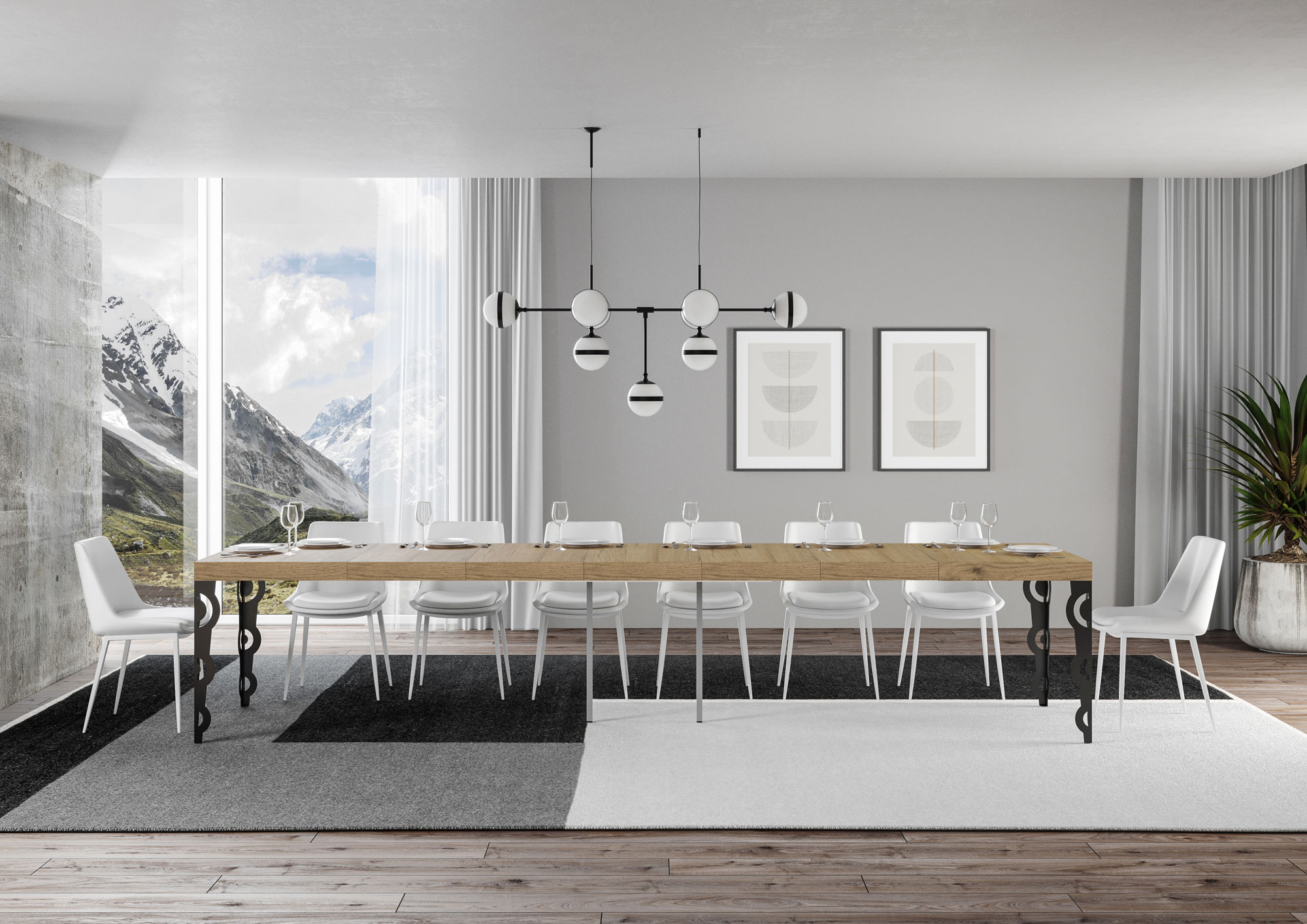 Mesa extensible Karamay Premium 180, con diseño moderno, elegante y extravagante, se adapta a cualquier estilo de decoración y se revela ideal tanto como mesa de comedor como elemento de decoración para la sala de estar, donde recibir a los invitados con estilo. La mesa extensible Karamay Premium puede extenderse progresivamente hasta 440 cm y puede acomodar 18 personas. Hecha con paneles de melamina, patas en hierro, tapa y extensiones trabajadas con proceso miter folding. El sistema de extensión con guías telescópicas de aluminio hacen que la mesa sea estable y robusta también cuando totalmente extendida, sin que necesite ningún soporte adicional. Cuando no se utilizan, las extensiones no encuentran espacio al interno de la estructura y deben ser almacenadas en otro lugar. Producto Itamoby Made in Italy Dimensiones: Mesa cerrada: L.180 A.90 AL.77 cm Longitud con 1 extensión: 232 cm Longitud con 2 extensiones: 284 cm Longitud con 3 extensiones: 336 cm Longitud con 4 extensiones: 388 cm Longitud con 5 extensiones: 440 cm