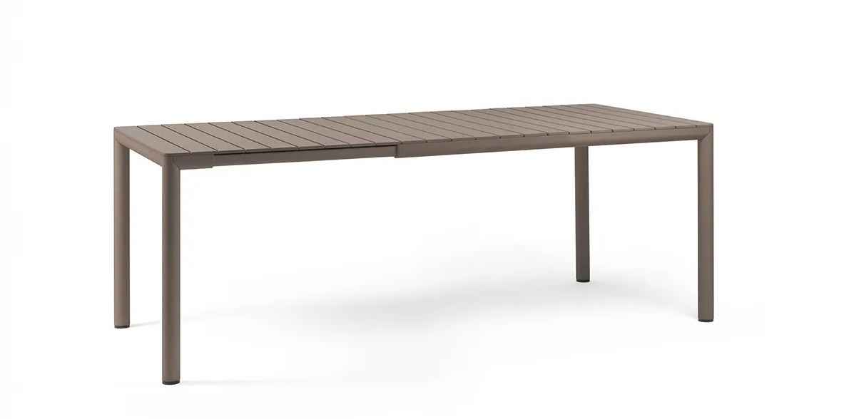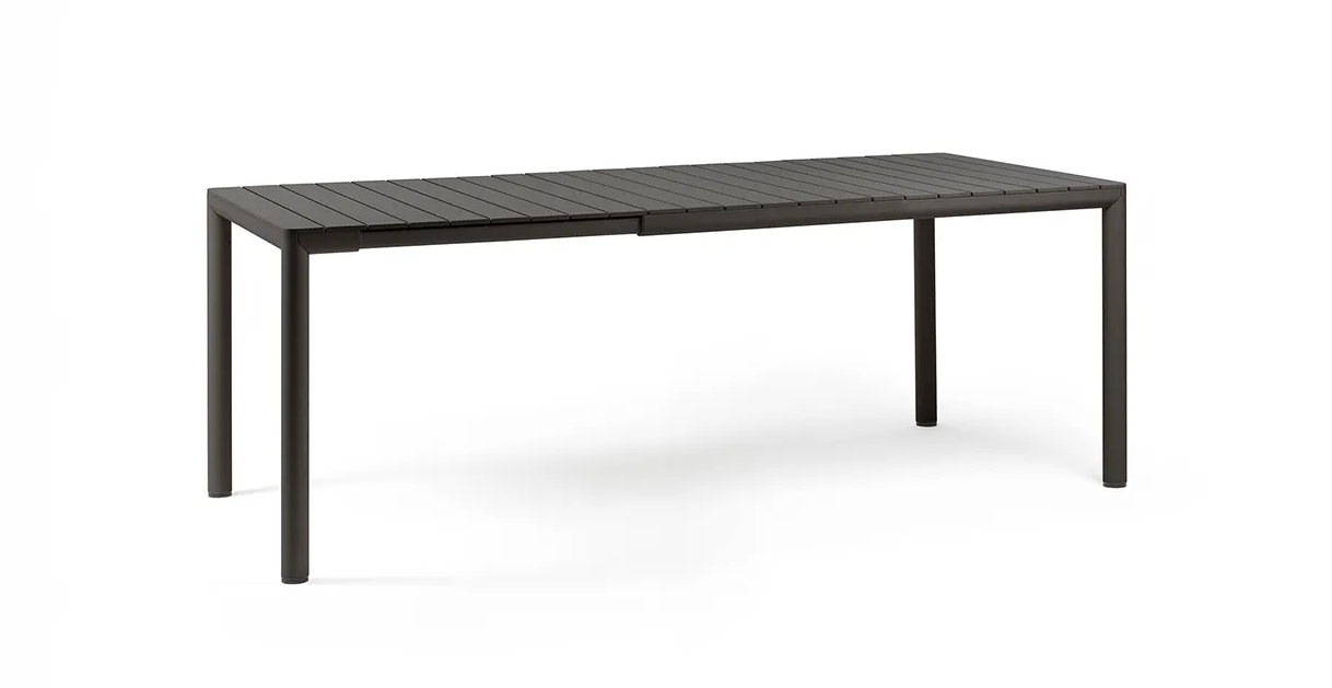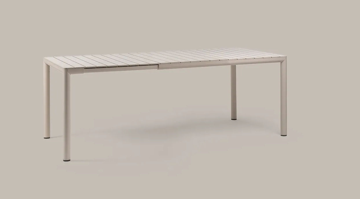 Alma verde y líneas suaves, jugadas con la ausencia de aristas vivas y las formas redondeadas de las patas, para la mesa extensible de exterior Tevere.