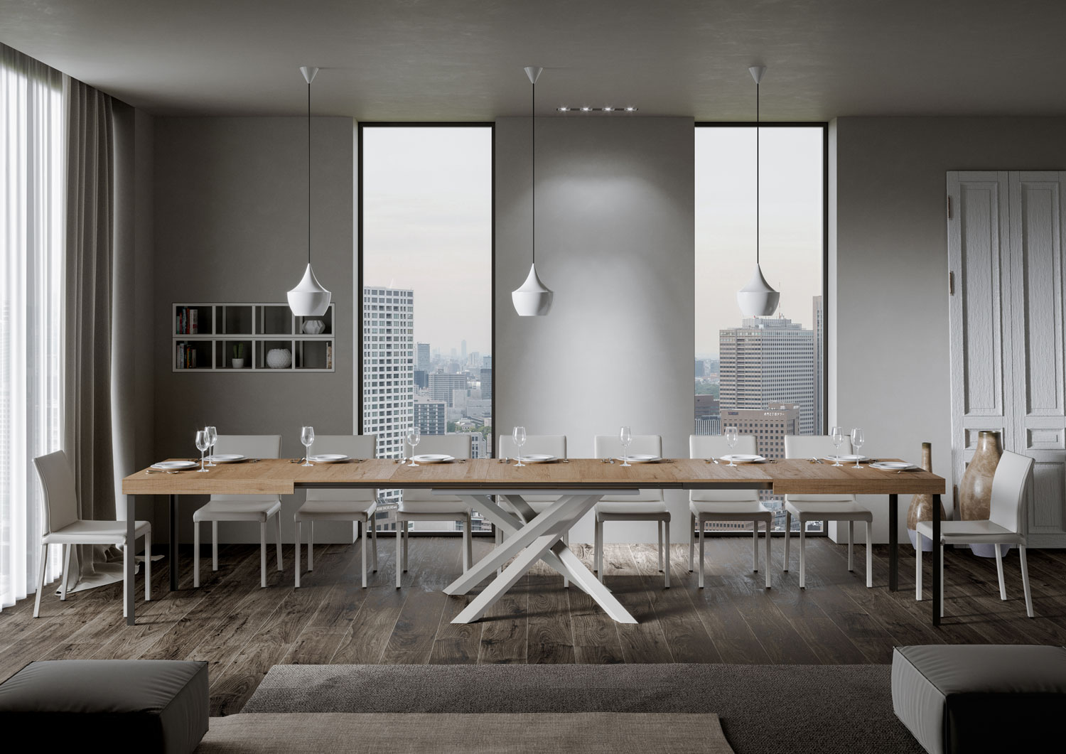Mesa extensible Volantis 180, con diseño moderno y sofisticado, se adapta a cualquier estilo de decoración y se revela ideal tanto como mesa de comedor como elemento de decoración para la sala de estar, donde recibir a los invitados con estilo. La mesa extensible Volantis puede extenderse progresivamente hasta 440 cm y puede acomodar 18 personas. Hecha con paneles de melamina, patas en hierro, tapa trabajada con proceso miter folding. El sistema de extensión con guías telescópicas de aluminio y los soportes laterales suministrados hacen que la mesa sea estable y robusta también cuando totalmente extendida. Cuando no se utilizan, dos extensiones se pueden almacenar debajo de la tapa superior, listas para el uso, las otras tres tienen que ser guardads en otro lugar. Producto Itamoby Made in Italy Dimensiones: Mesa cerrada: L.180 A.90 AL.77 cm Longitud con 1 extensión: 232 cm Longitud con 2 extensiones: 284 cm Longitud con 3 extensiones: 336 cm Longitud con 4 extensiones: 388 cm Longitud con 5 extensiones: 440 cm