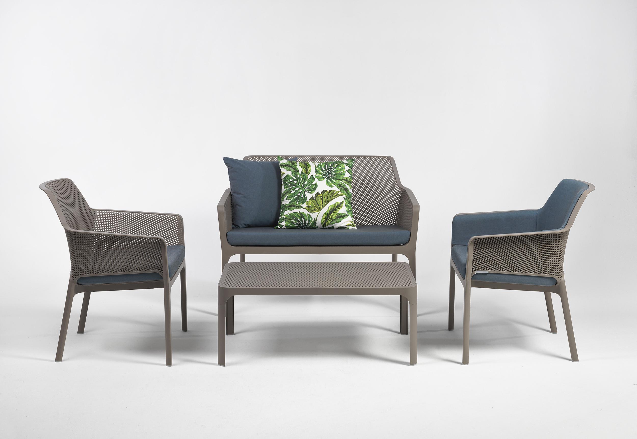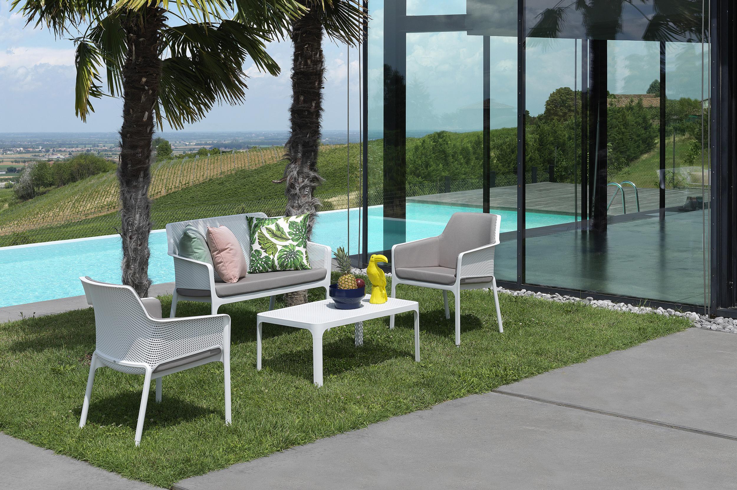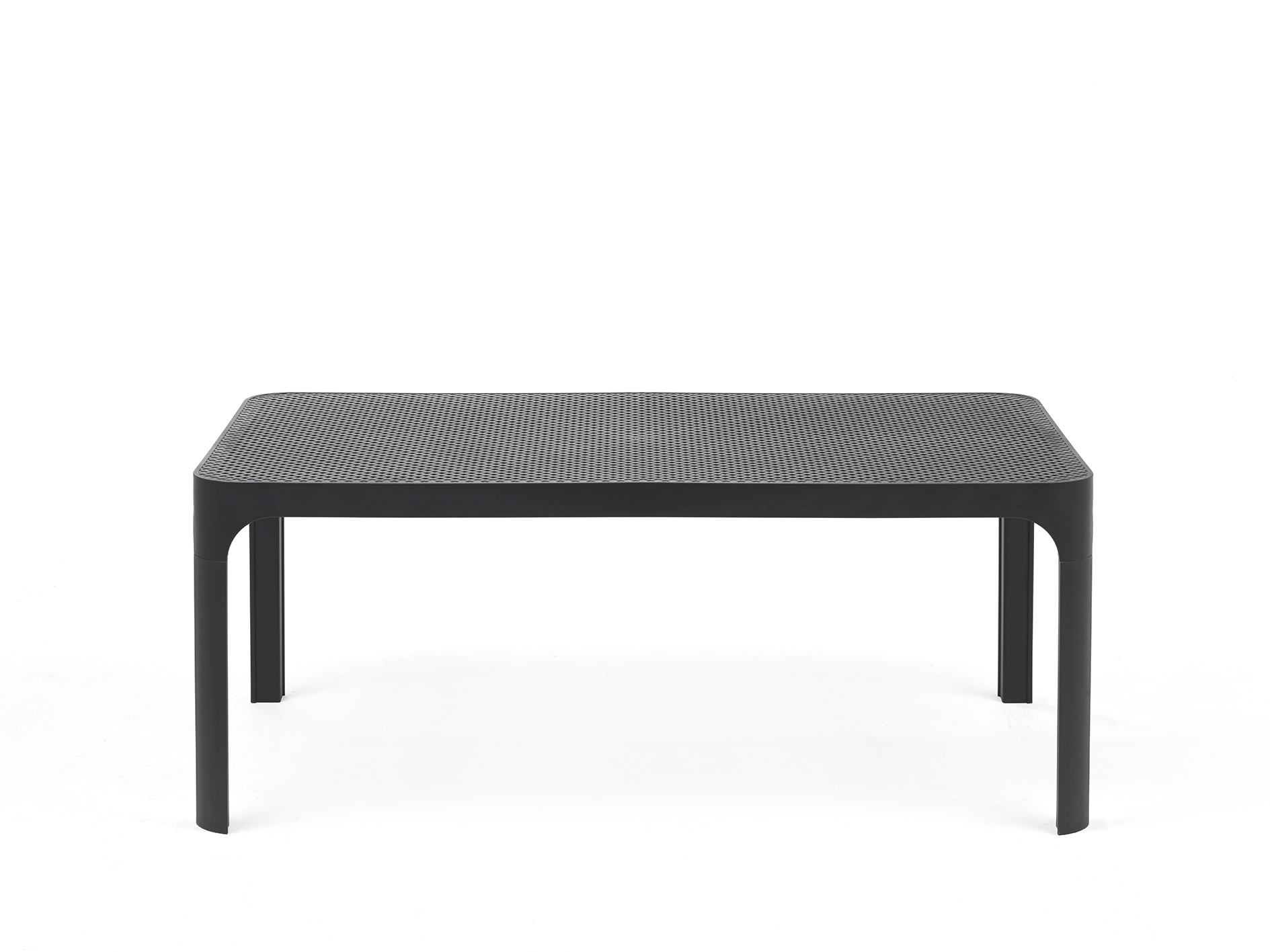 Mesa baja. Material: polipropileno de fibra de vidrio con tratamiento anti-UV y teñido en masa. Acabado mate. Equipado con pies antideslizantes. Resina reciclable.