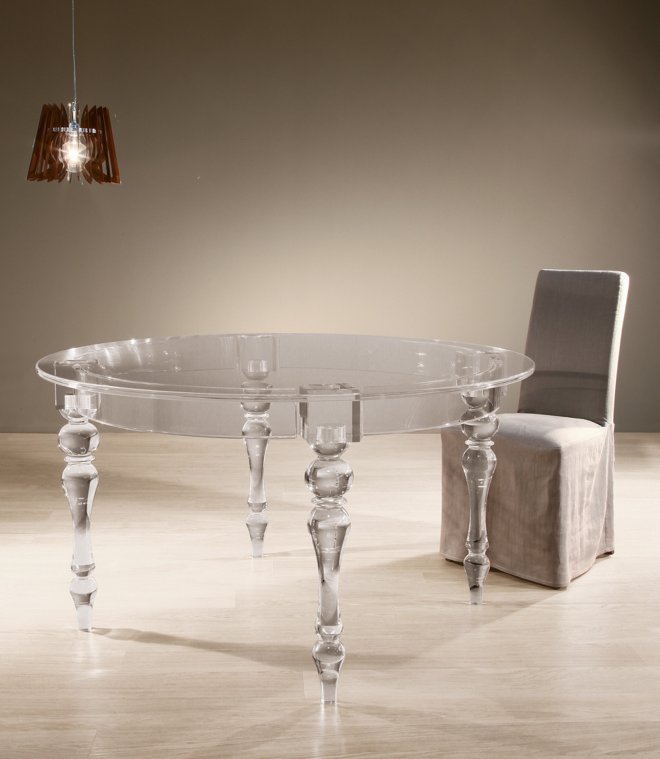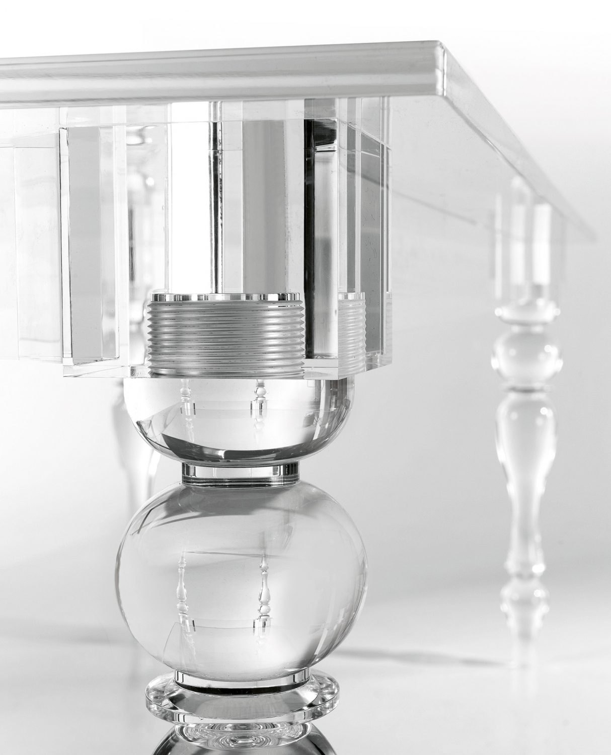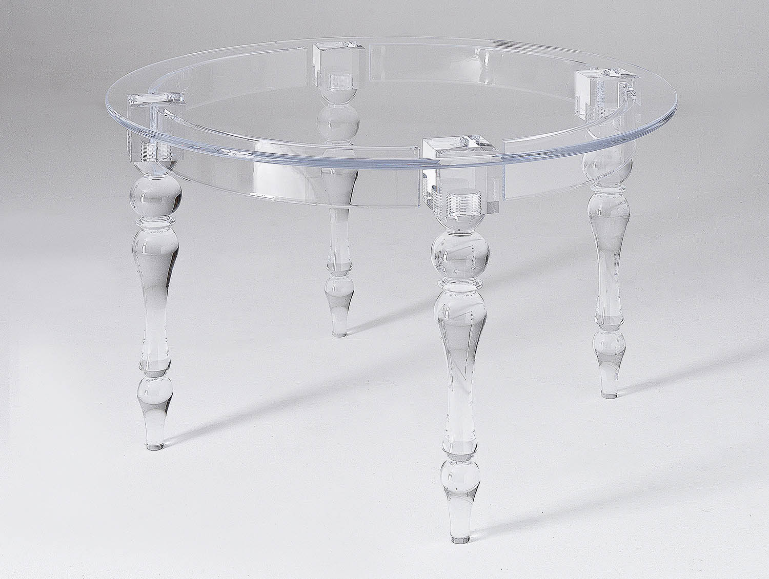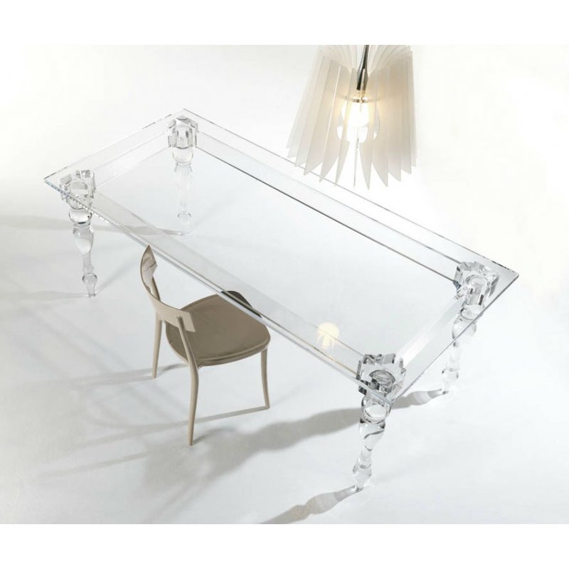 Mesa con estructura y tapa íntegramente de metacrilato, reciclable y apta para exterior.