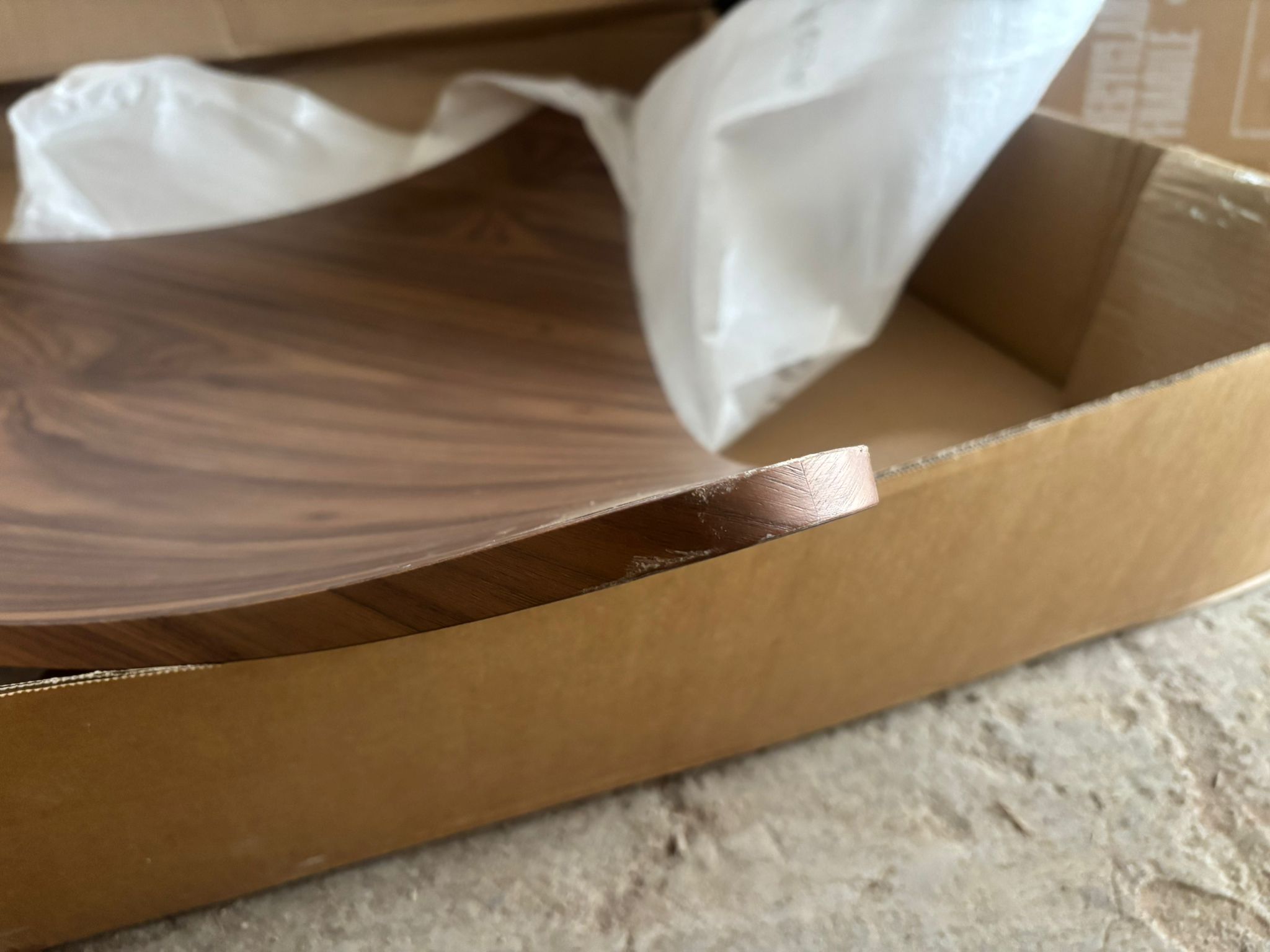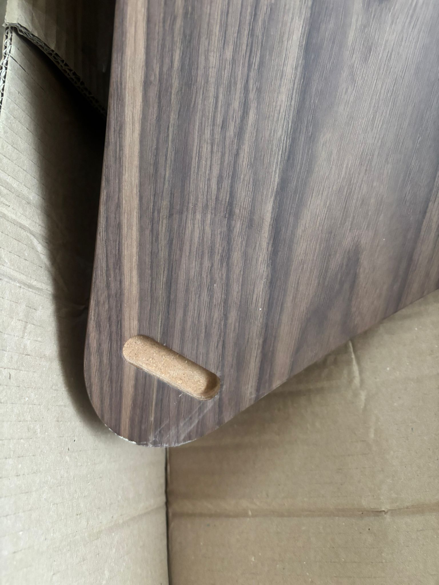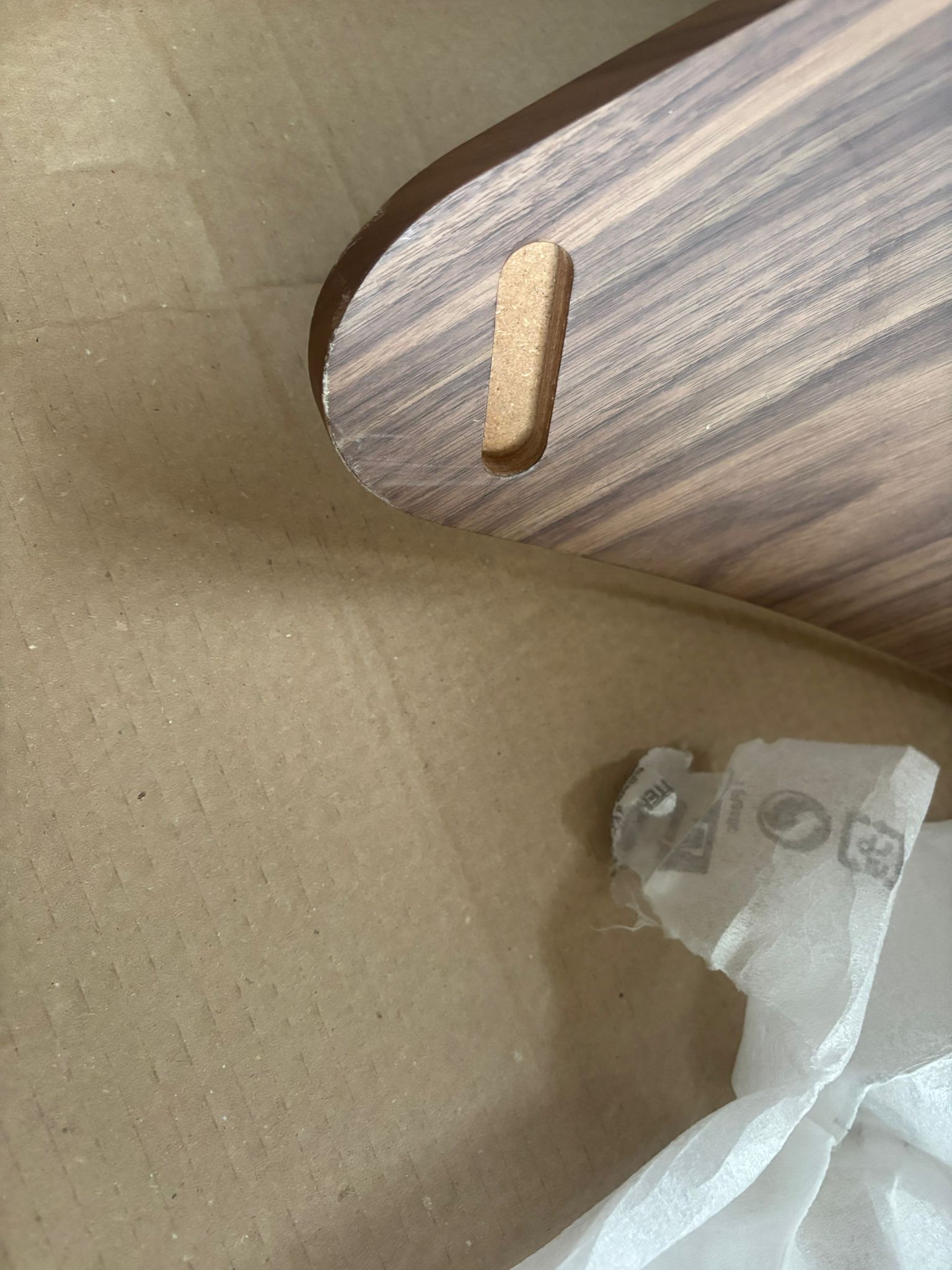 Mesa de centro en MDF lacado curvo o cubierto de madera con tapa de cristal curvado.