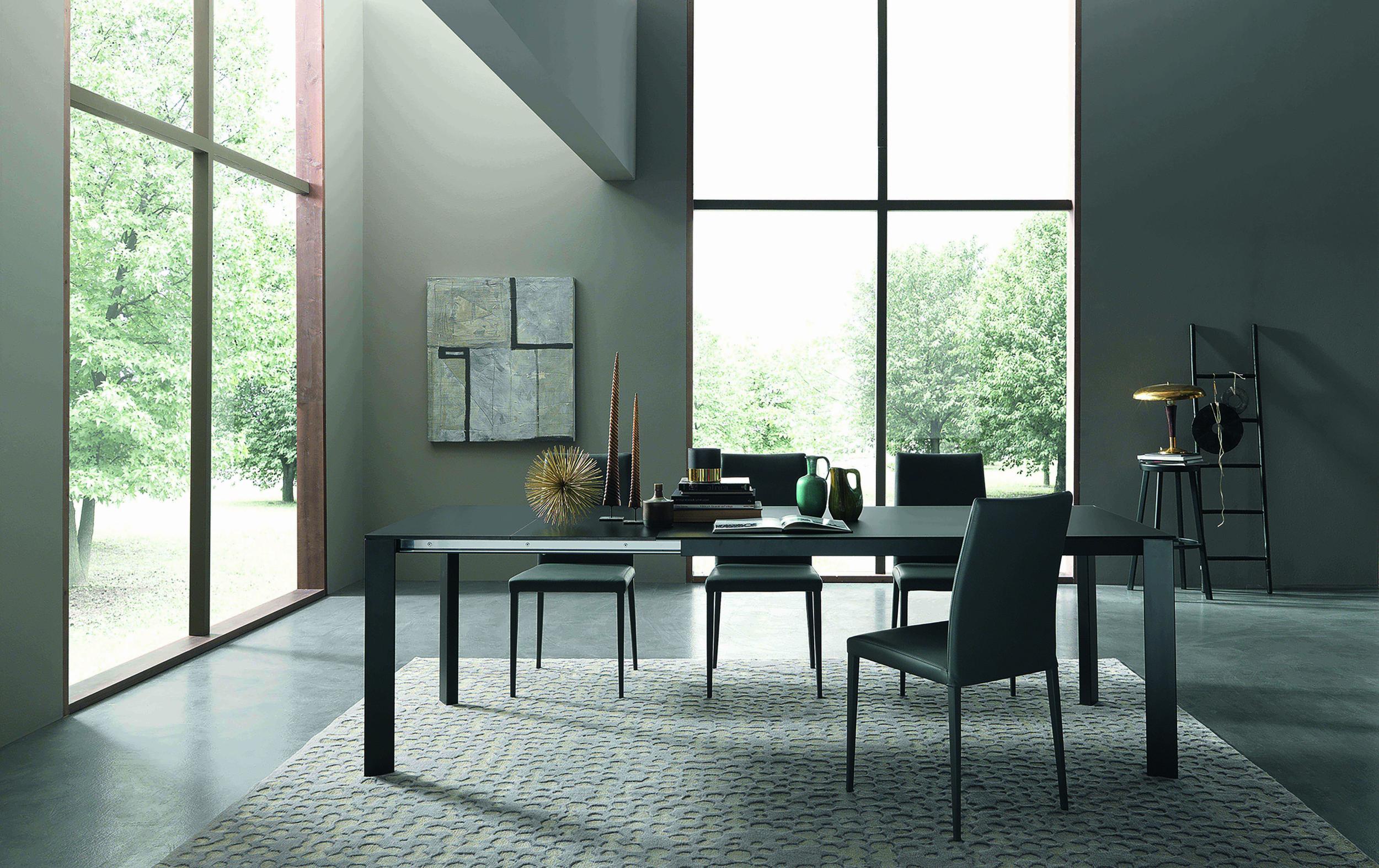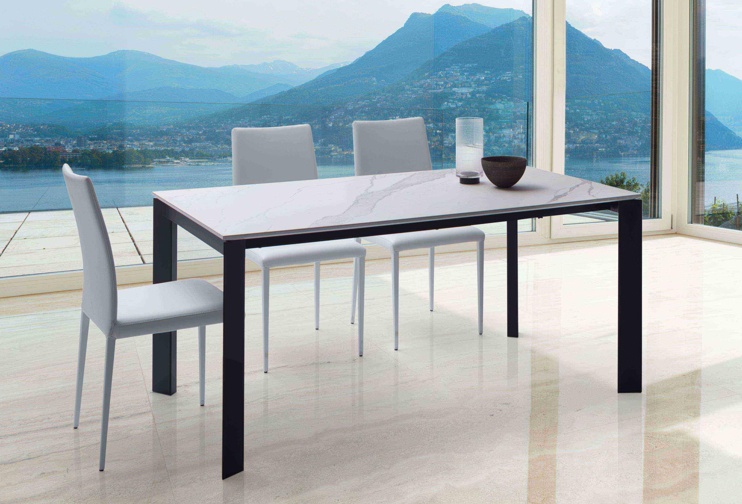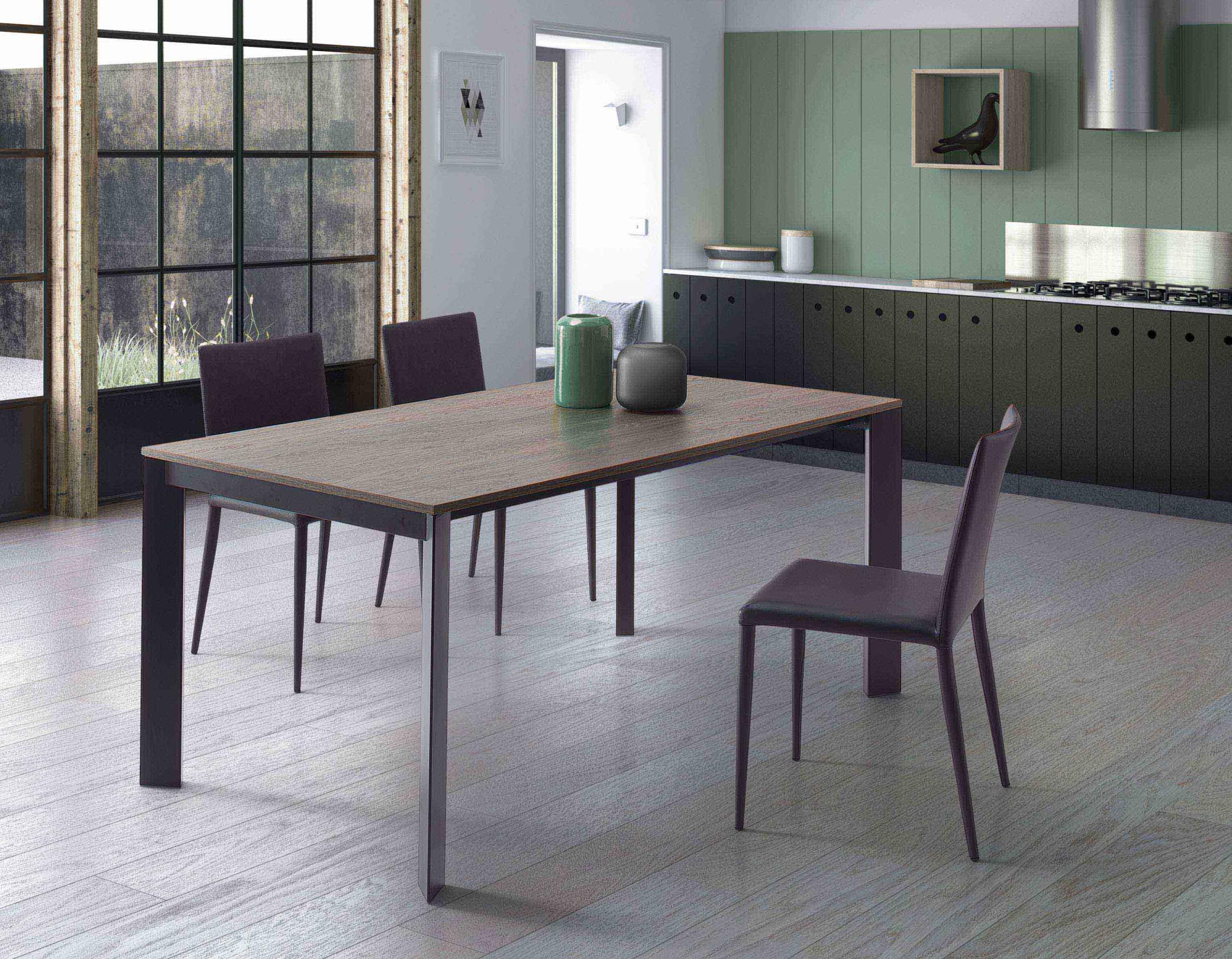 Mesa de comedor extensible, estructura de metal, mecanismo telescópico, tablero en melamina, cristal, madera, efecto mortero o cerámica, extensión interior tipo libro.