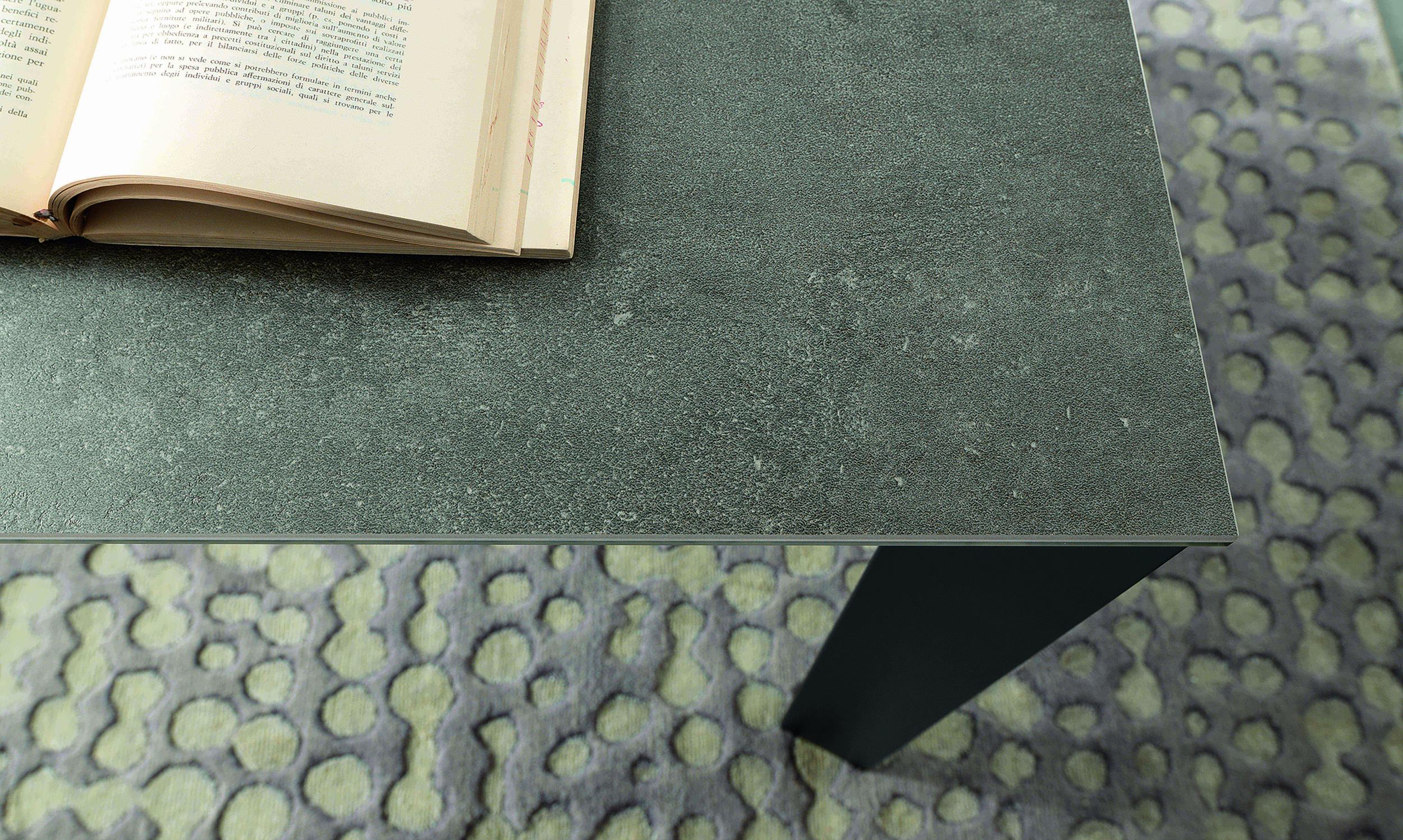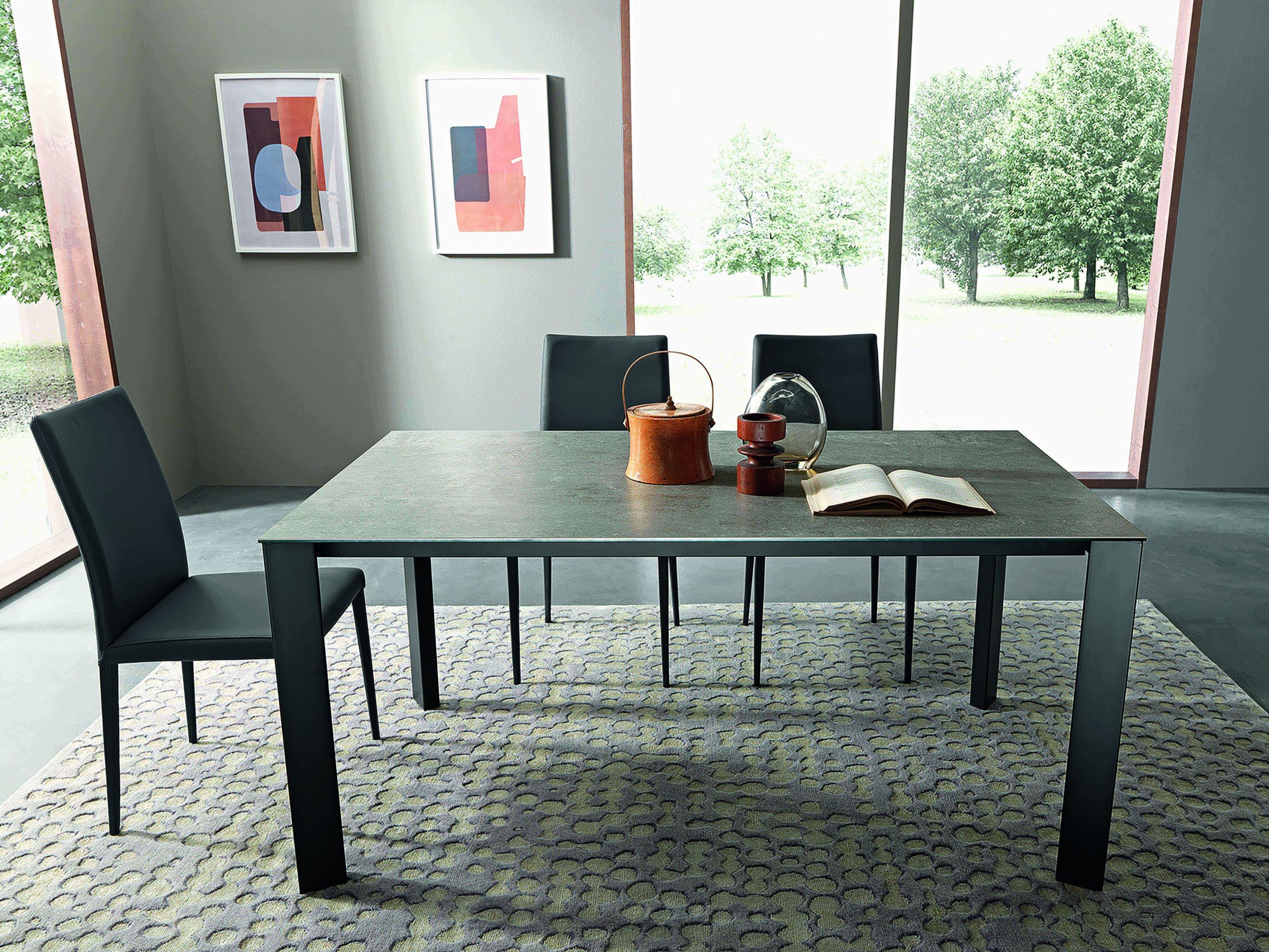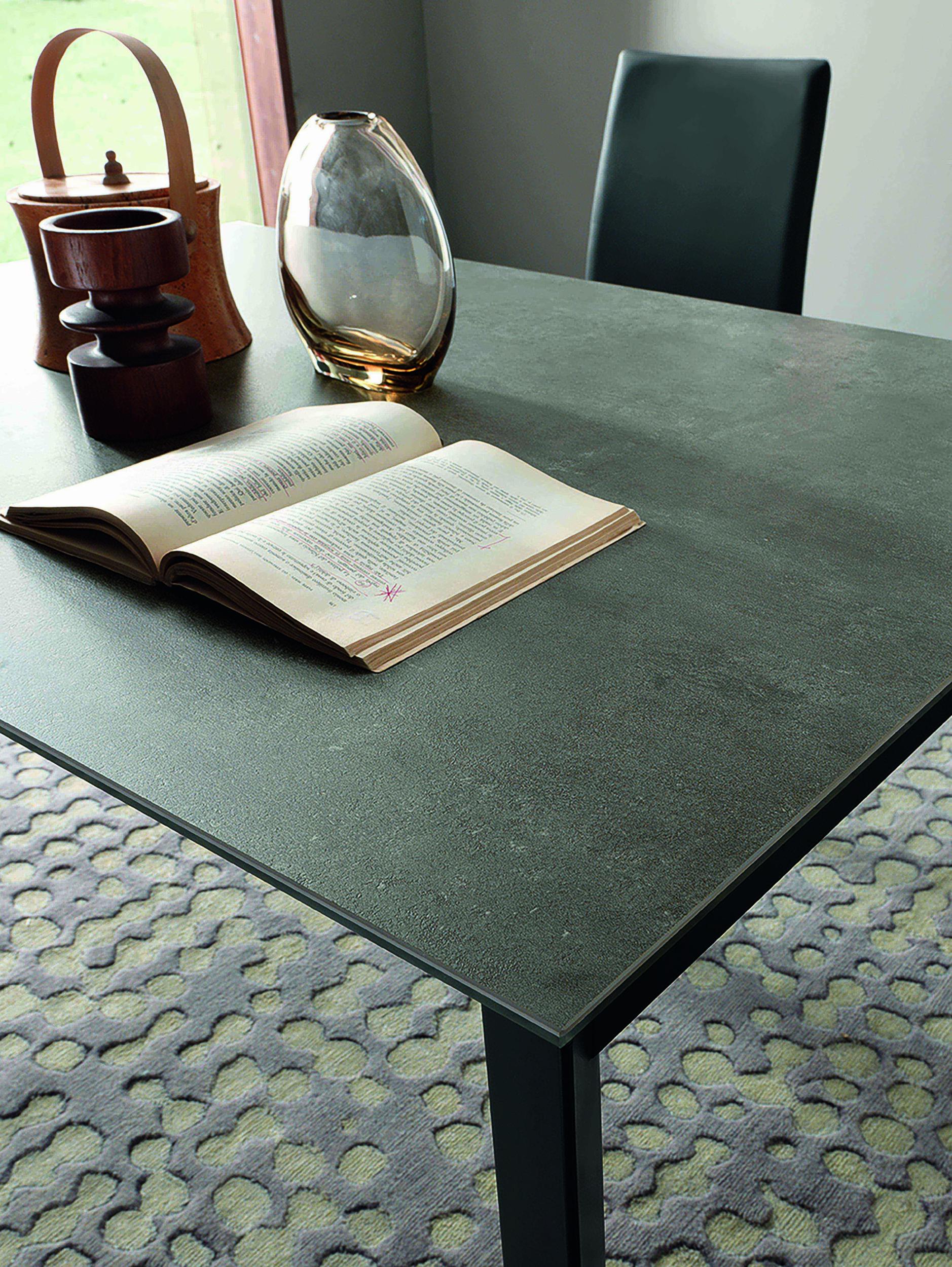 Mesa de comedor extensible, estructura de metal, mecanismo telescópico, tablero en melamina, cristal, madera, efecto mortero o cerámica, extensión interior tipo libro.