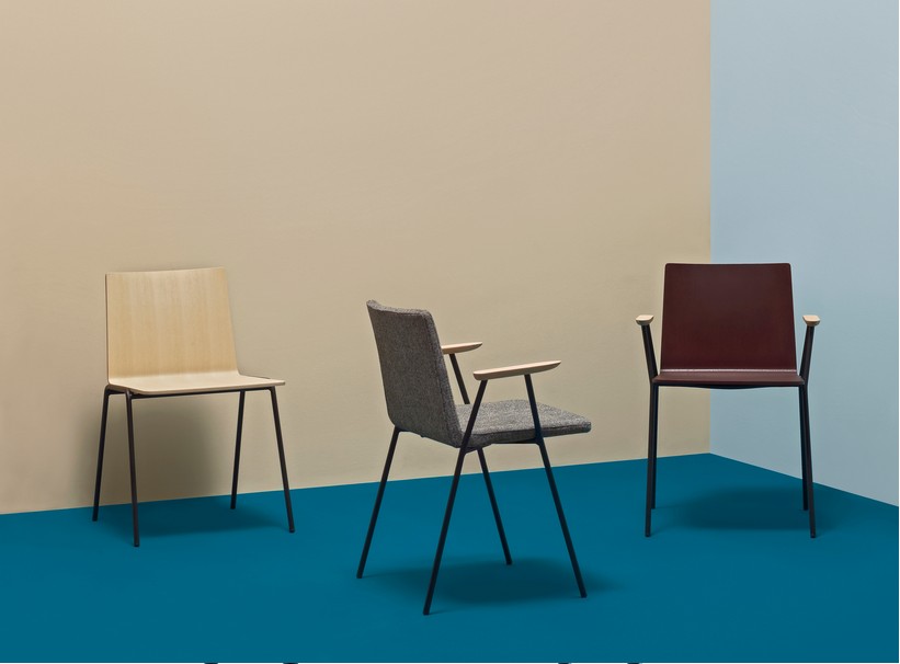Osaka Metal es una colección de sillas que confirma el enfoque funcionalista de la colección como resultado de una gran ergonomía y un efecto gráfico de mayor ligereza. El perfil recto revela una acogedora tridimensionalidad completada por el bienestar táctil de la madera.
