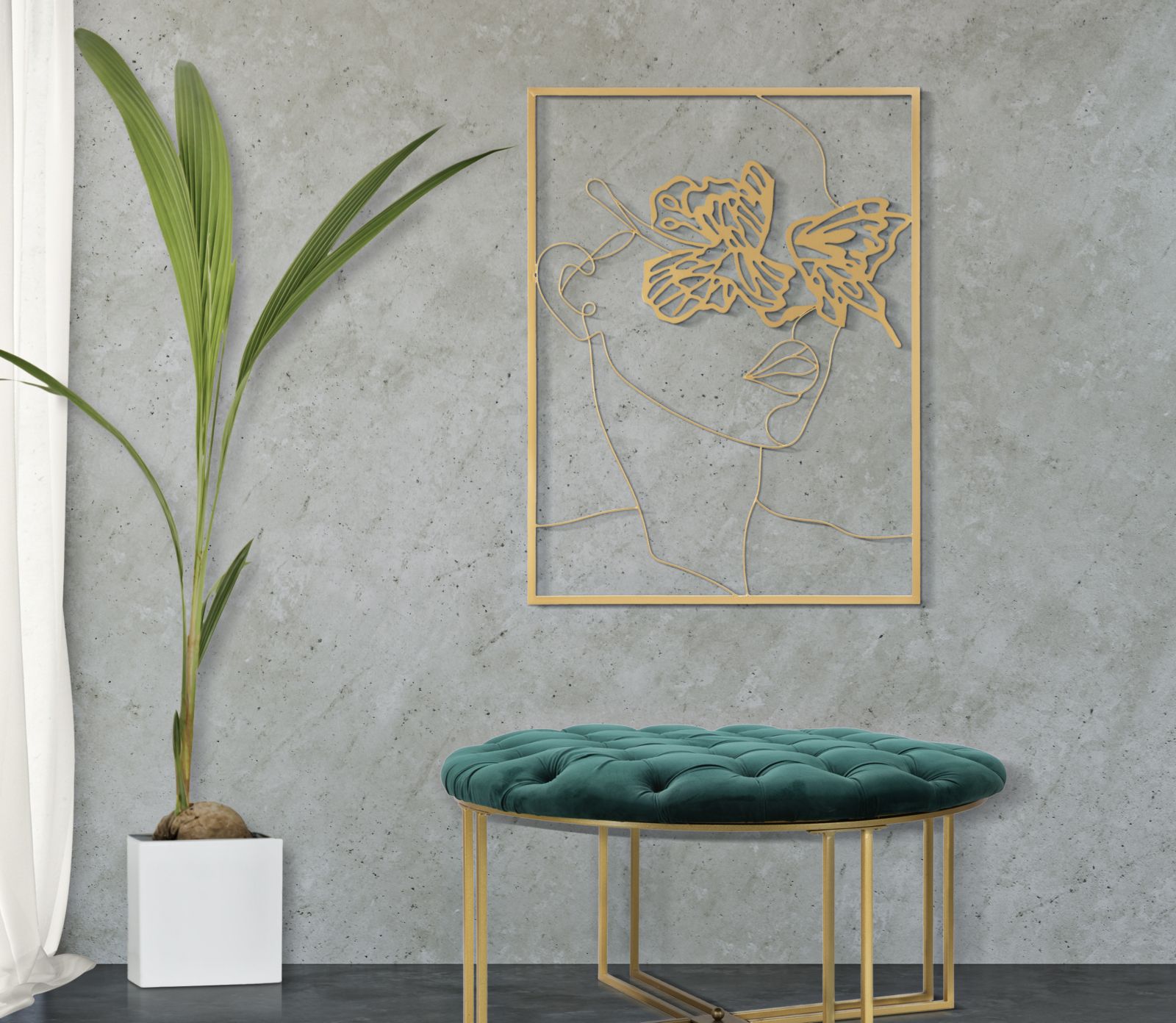 Panel decorativo de pared 3D con elementos sencillos y esenciales que componen una cara con mariposas, todo ello encerrado en un marco rectangular.