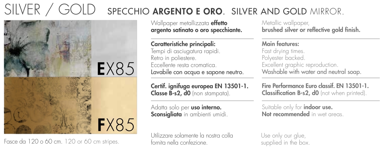 Papel pintado metalizado con efecto plata satinada.