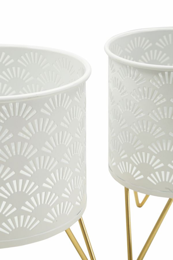 Pareja de porta-jarrones de metal blanco elegantemente decorados con tallas geométricas regulares. Completo con soporte de metal dorado. Las macetas son desmontables de los soportes.