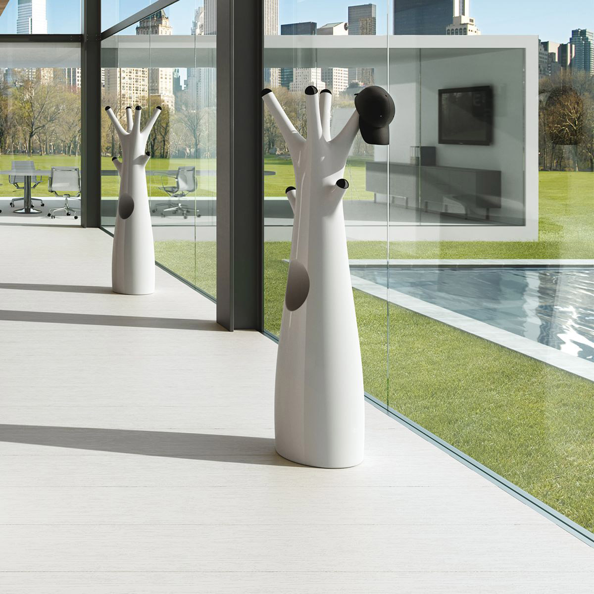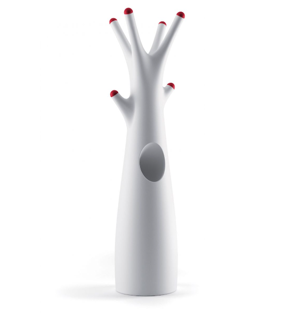 Perchero con claras referencias a un mundo natural y fantástico. Equipado con un compartimento central vacío y apéndices intercambiables de diferentes colores, se adapta tanto a espacios privados como públicos, como salas de espera o vestíbulos de hotel.