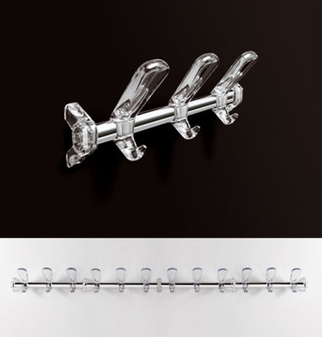 Perchero de pared de seis lugares (3 perillas y 3 ganchos) compuesto por una barra de soporte de acero cromado con sección ovalada de 15x30 mm, equipado con tres elementos de suspensión