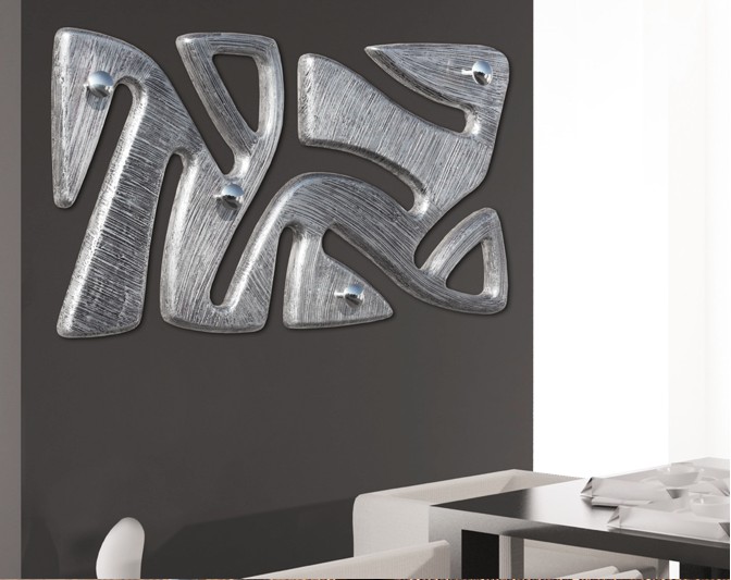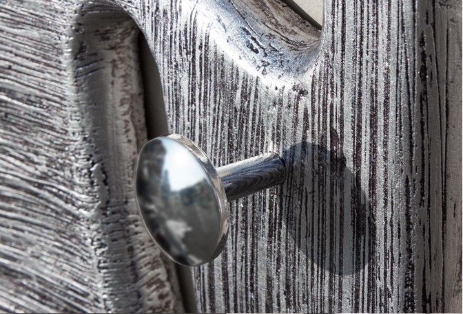 Percha en forma y decorada a mano en pan de plata con textura, cuatro perillas cromadas, acabado brillante.