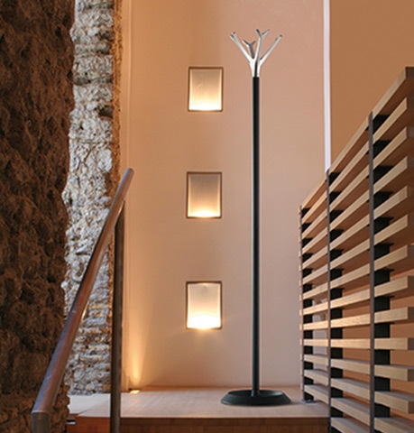 Lámpara de pie en acero tubular de Ø 32 mm, fijada a la base por medio de un tornillo M8 en acero galvanizado, pintada con polvos epoxídicos en colores negro, gris plata u blanco opaco.