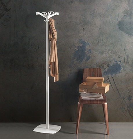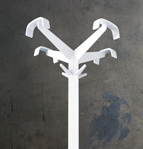 Perchero hecho de una base de acero de 6 mm de espesor pintada con polvos epoxi blancos opacos.